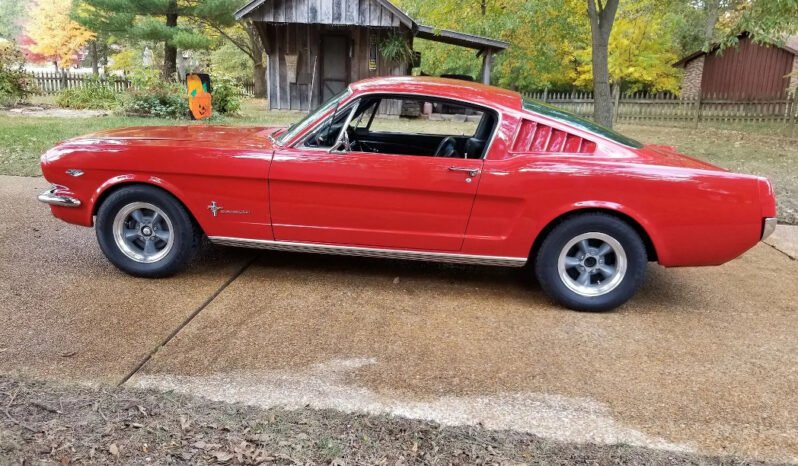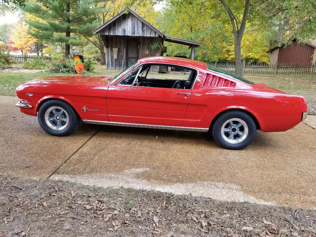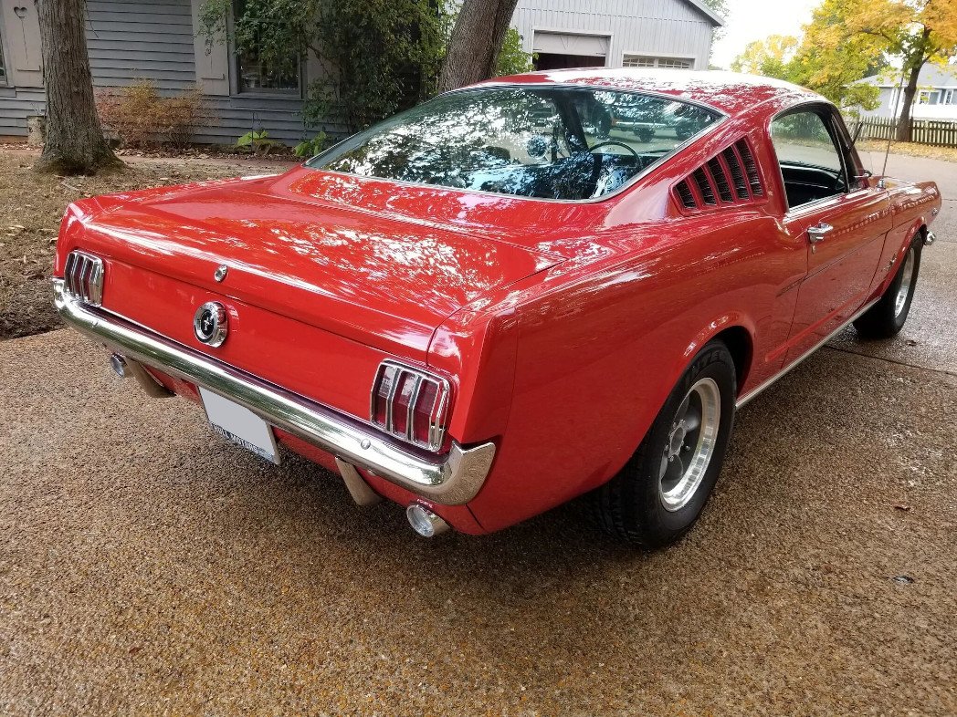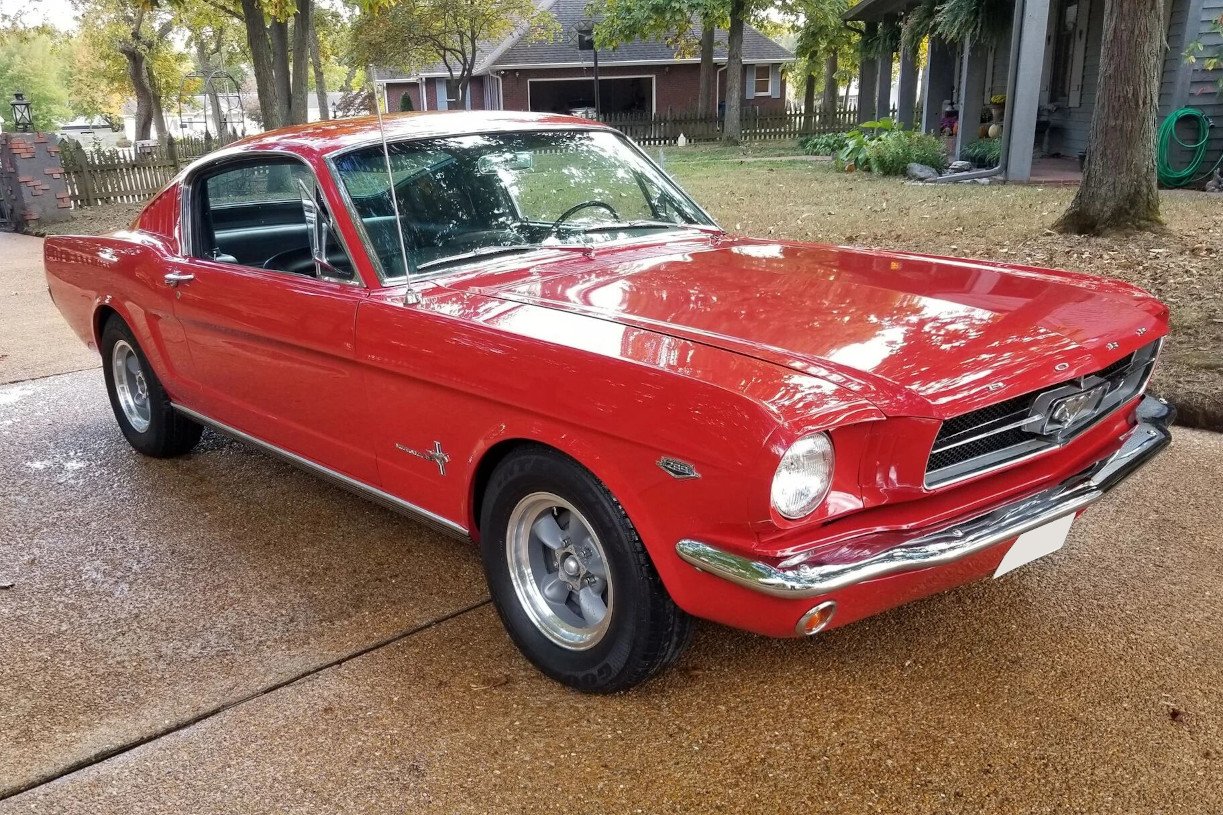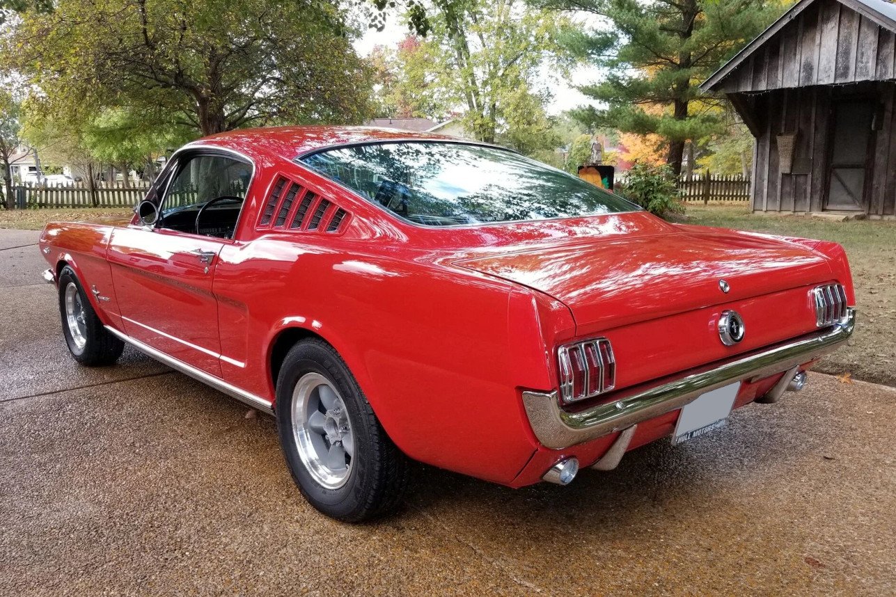 This 1965 Ford Mustang fastback is finished in red over a black vinyl interior and is powered by a K-code 289ci V8 paired with a four-speed manual transmission.
