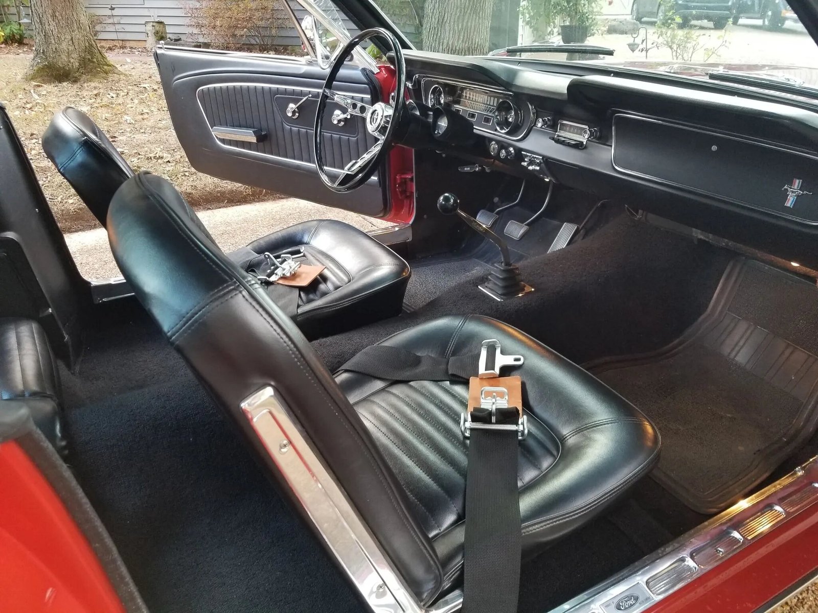 A Hurst shifter is topped with a black cue ball knob, and two-point race-style lap belts are equipped for the front occupants.