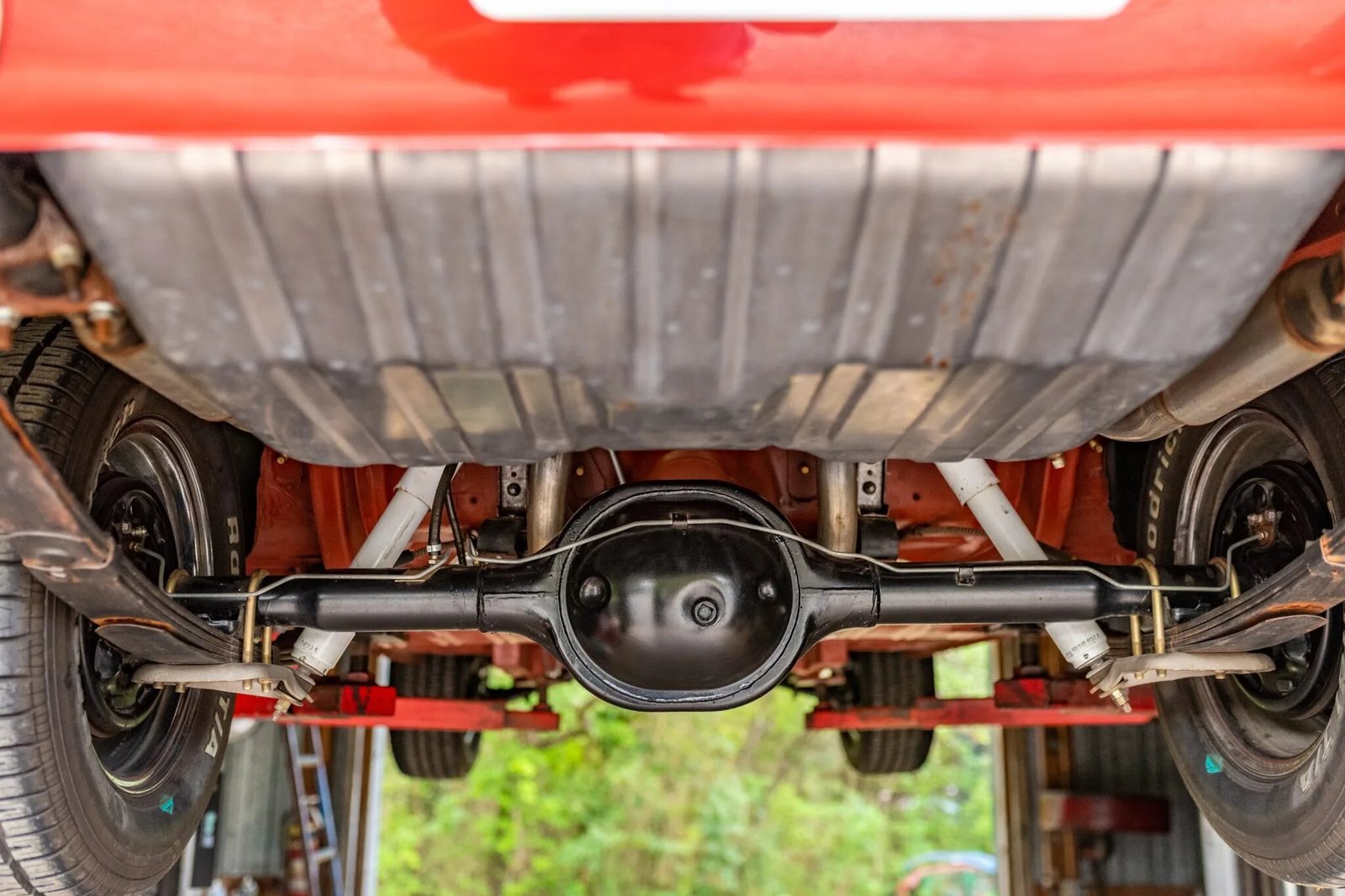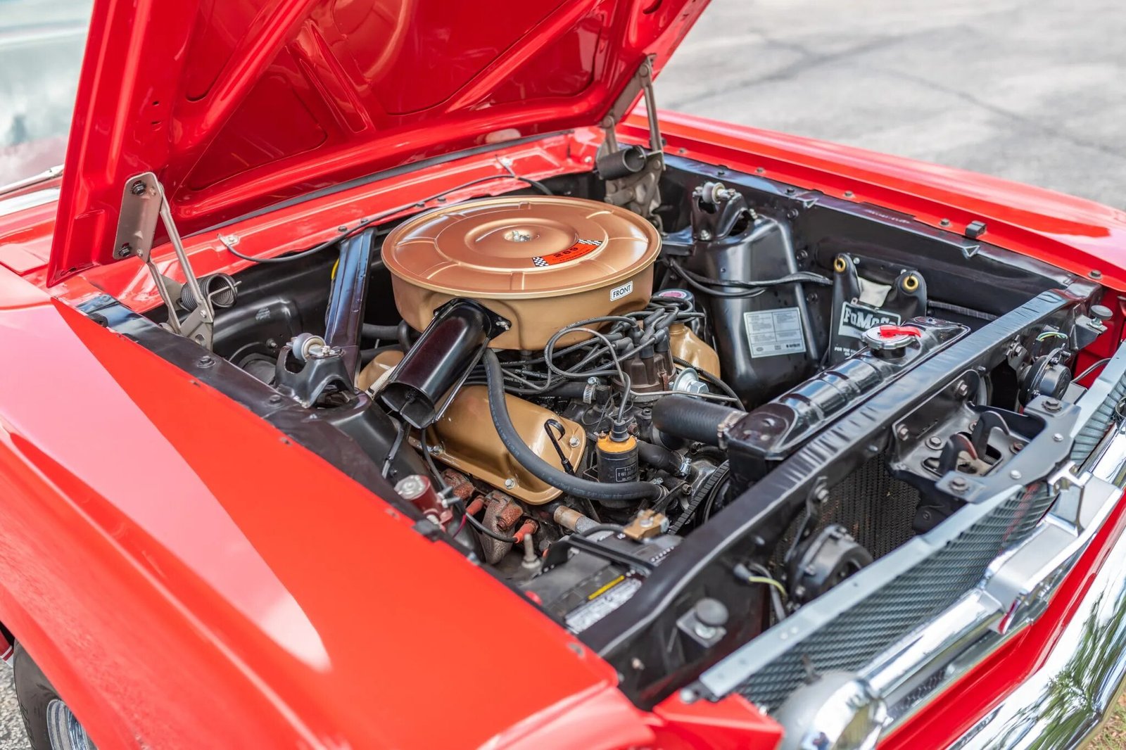The 302ci V8 was installed in place of the factory A-code 289ci engine and features a gold-finished air cleaner and valve covers. Power is sent to the rear wheels via a four-speed manual transmission and an open 3.00:1 differential. The fuel pump was replaced in preparation for sale.
