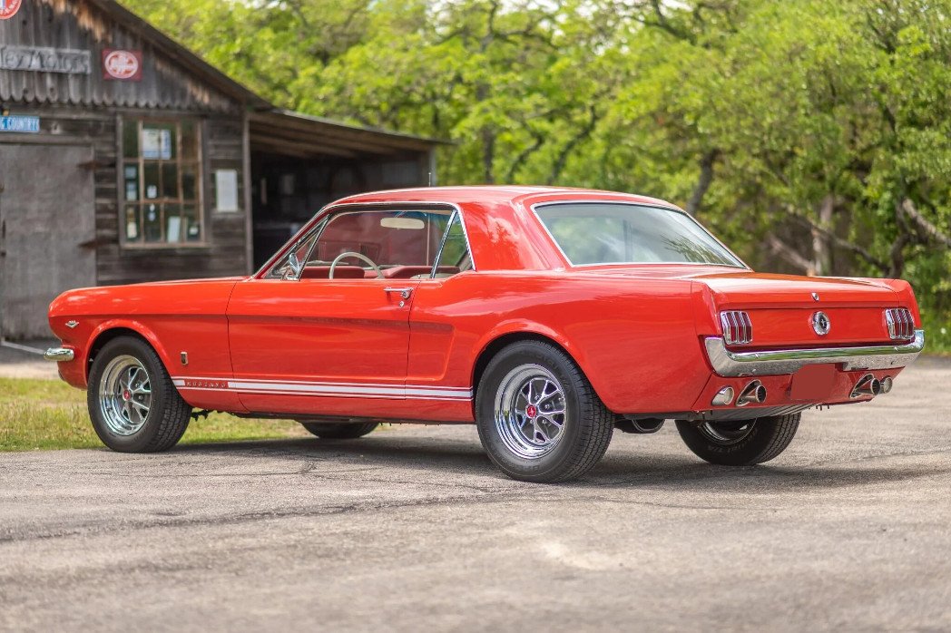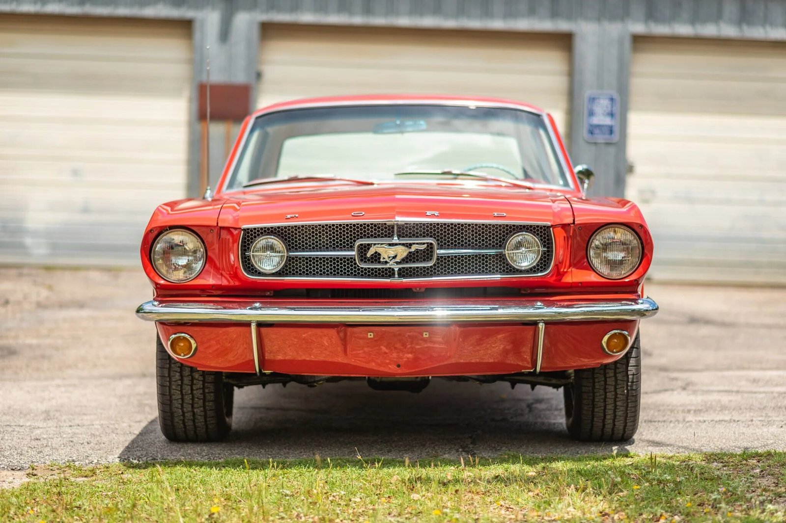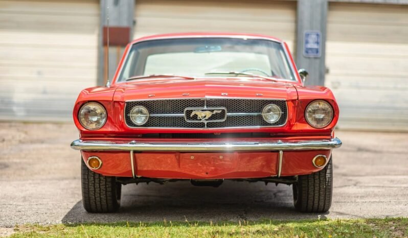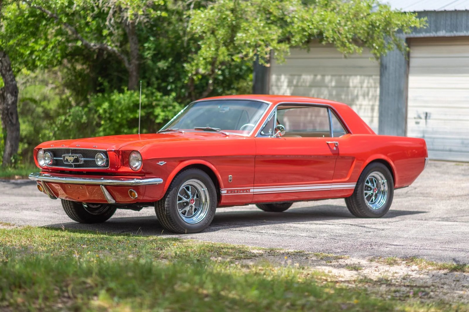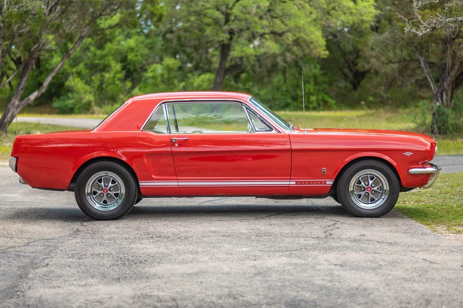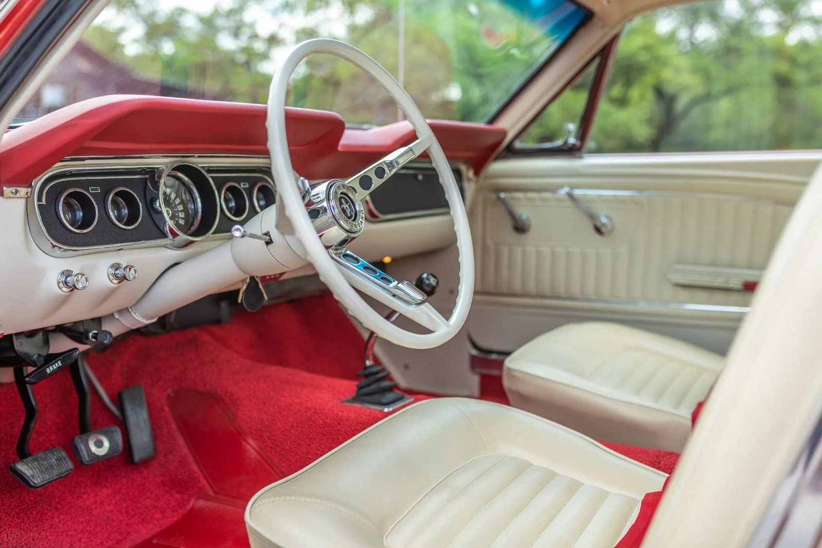 This 1965 Ford Mustang GT coupe was the subject of a refurbishment completed in 2016, which included refinishing the exterior in its factory Rangoon Red, reupholstering the white vinyl interior, and installing a 302ci V8. Additional equipment includes a four-speed manual transmission, front disc brakes, two-speed windshield wipers, and 15″ styled steel wheels.