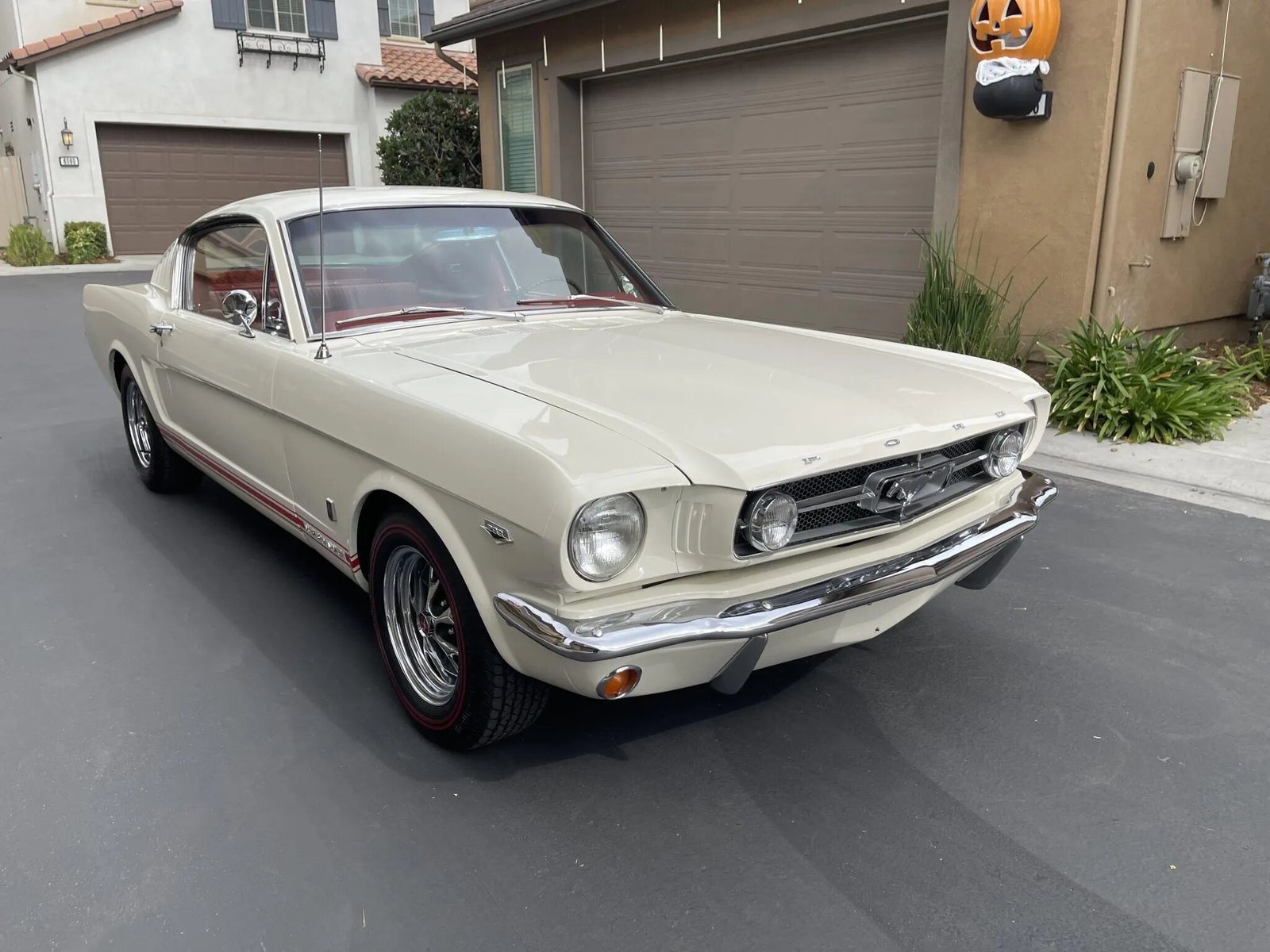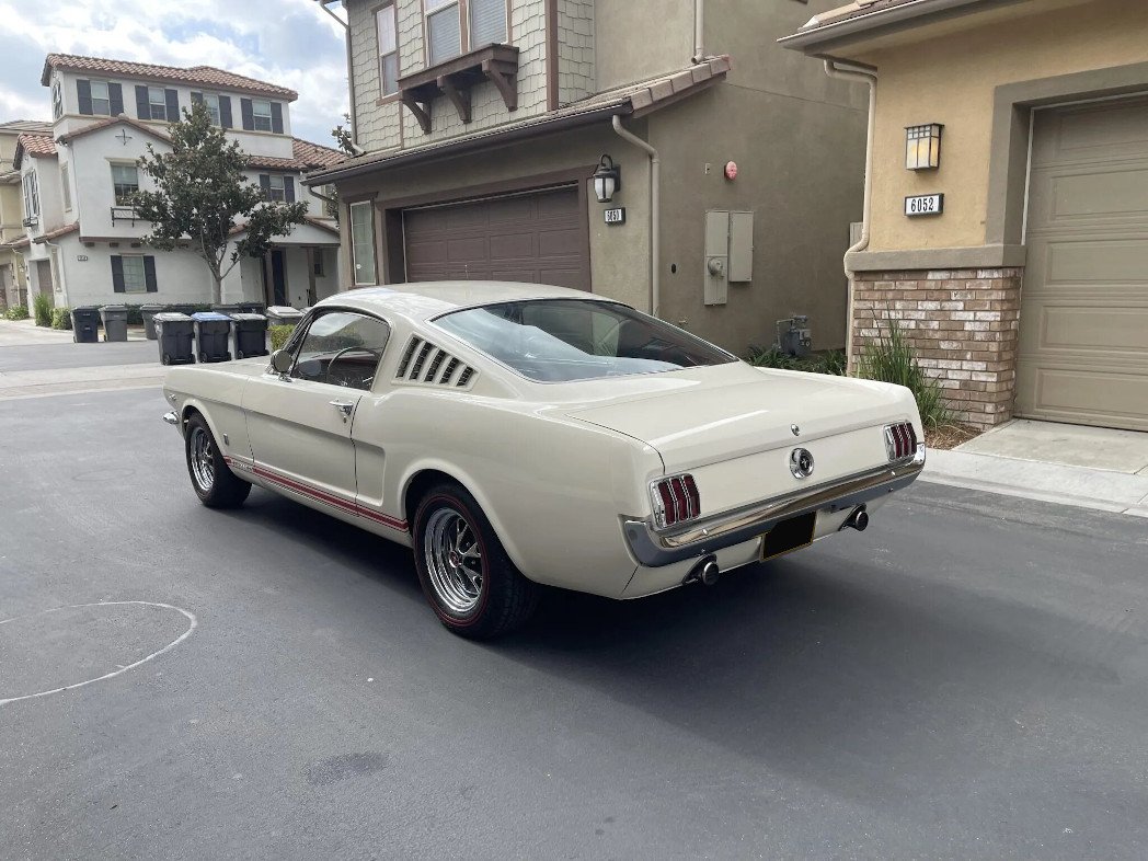 This 1965 Ford Mustang GT fastback is powered by a 289ci HiPo V8 paired with a four-speed manual transmission and is finished in white over red leather upholstery. Equipment includes GT trim, driving lamps, red side stripes, sail panel louvers, a push-button radio, a center console, and a column-mounted Rally-Pac tachometer and analog clock.