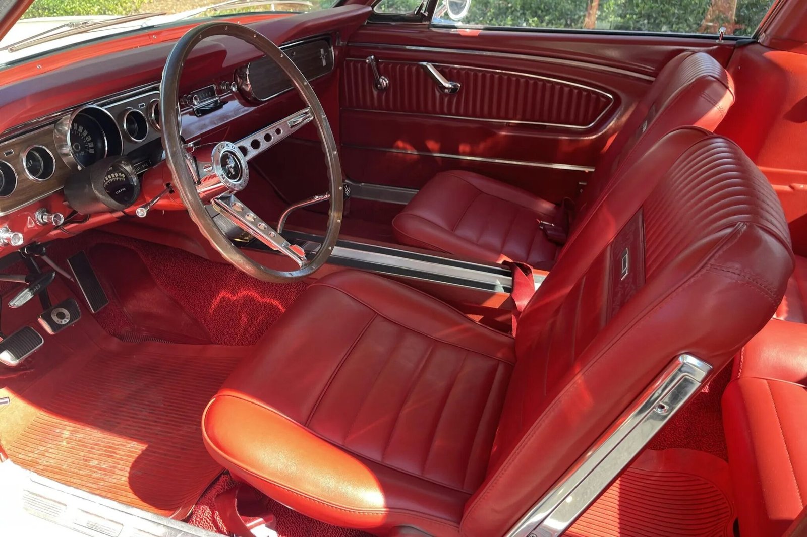 The wood-rimmed steering wheel frames a column-mounted Rally-Pac tachometer and analog clock as well as a 140-mph speedometer and gauges displaying fuel level, oil pressure, amperage, and coolant temperature.