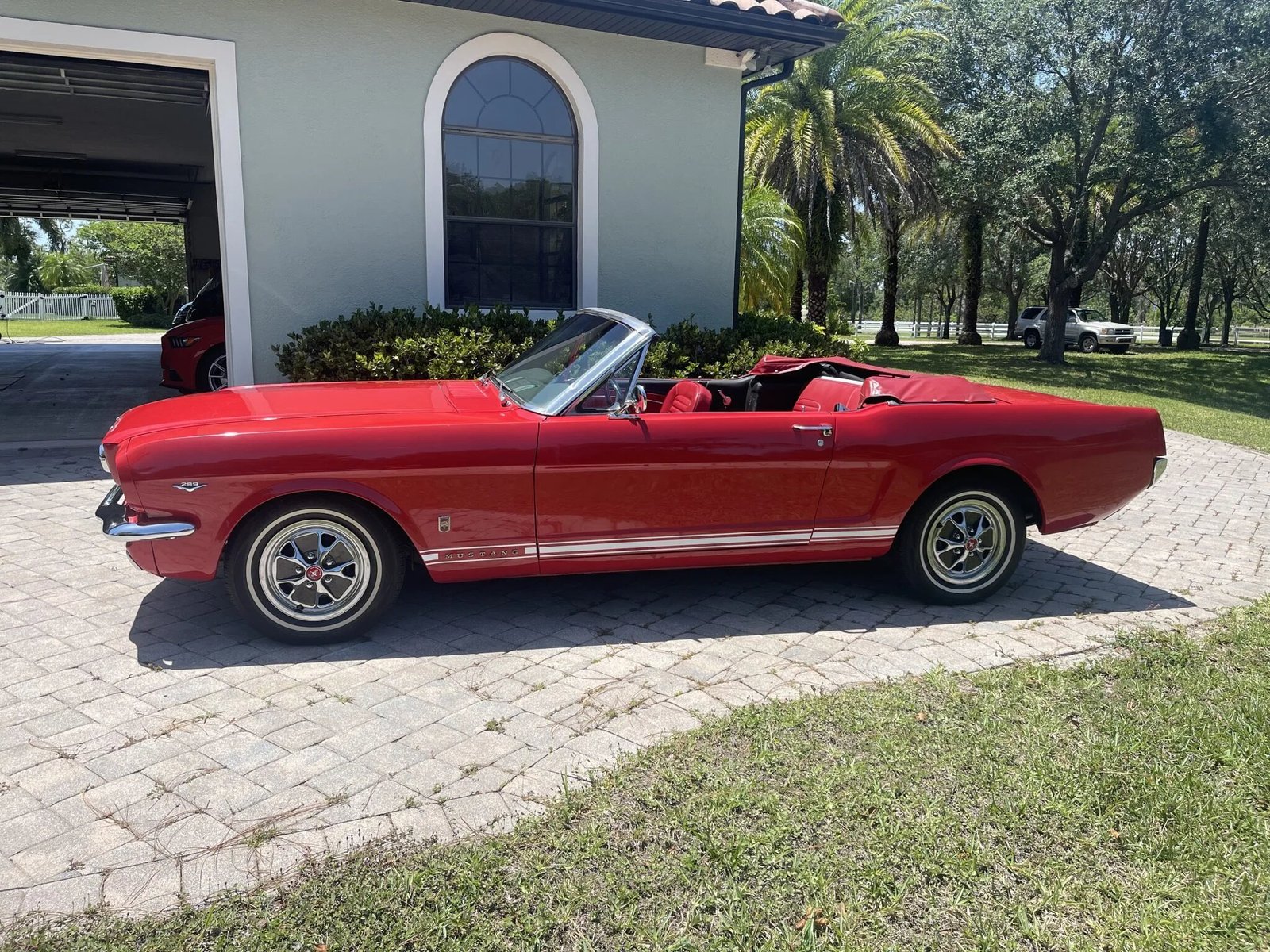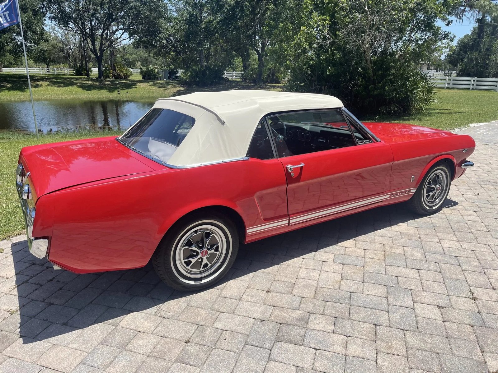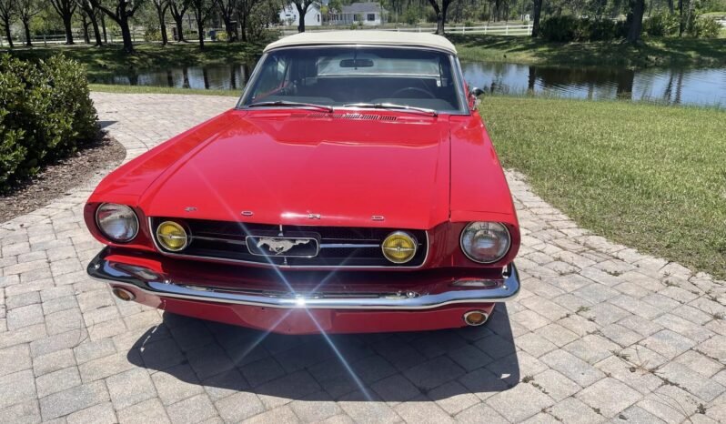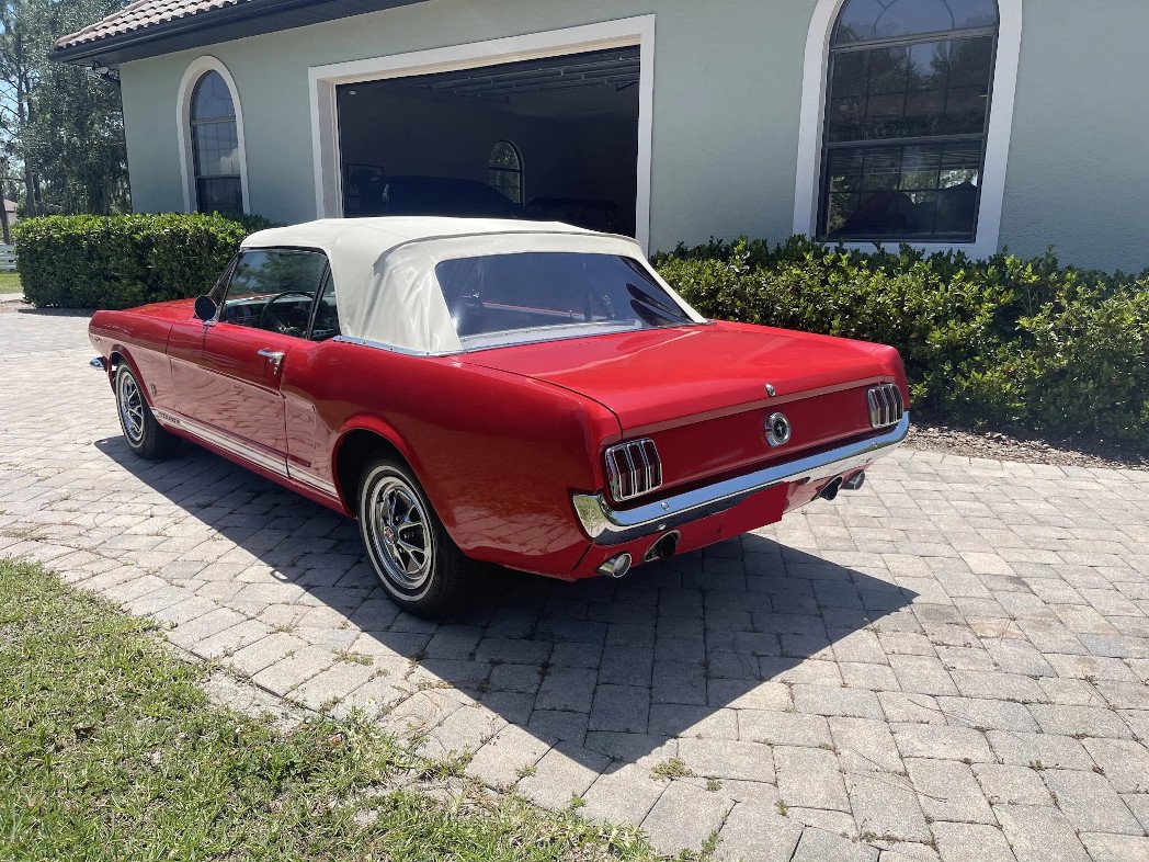 This 1965 Ford Mustang convertible is finished in red over matching vinyl upholstery and powered by a replacement 289ci V8 paired with a three-speed automatic transmission. Is equipped with a white soft top, a red top boot, an Edelbrock intake manifold, a Holley carburetor, woodgrain interior trim, and a push-button AM radio. The radiator and thermostat were replaced and an oil change was performed in preparation for the sale.