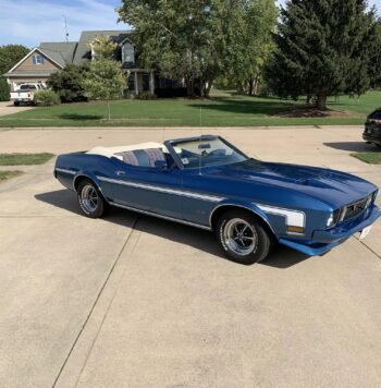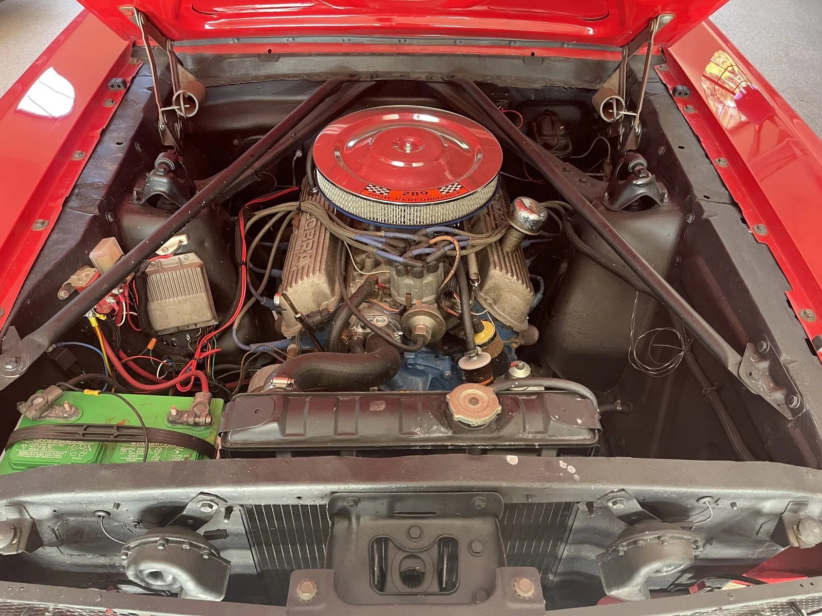 The factory inline-six was replaced with a 289ci V8 and has been fitted with a Holley carburetor, an Edelbrock intake manifold and electric fuel pump, Cobra-branded finned valve covers, exhaust headers, and electronic ignition components. Power is delivered to the rear wheels via a retrofitted three-speed automatic transmission with a floor shifter.