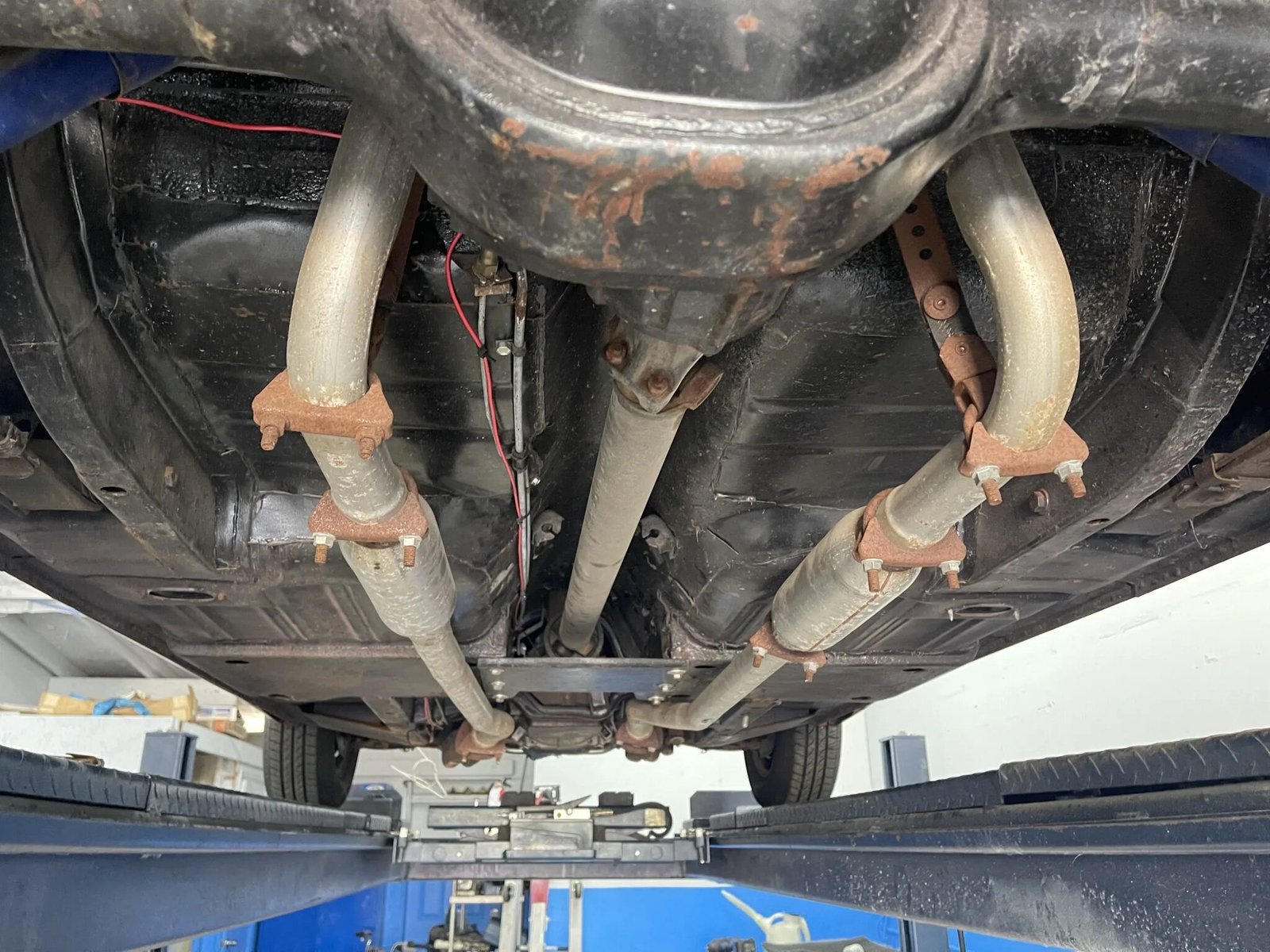 A spare wheel and older tire reside in the trunk.