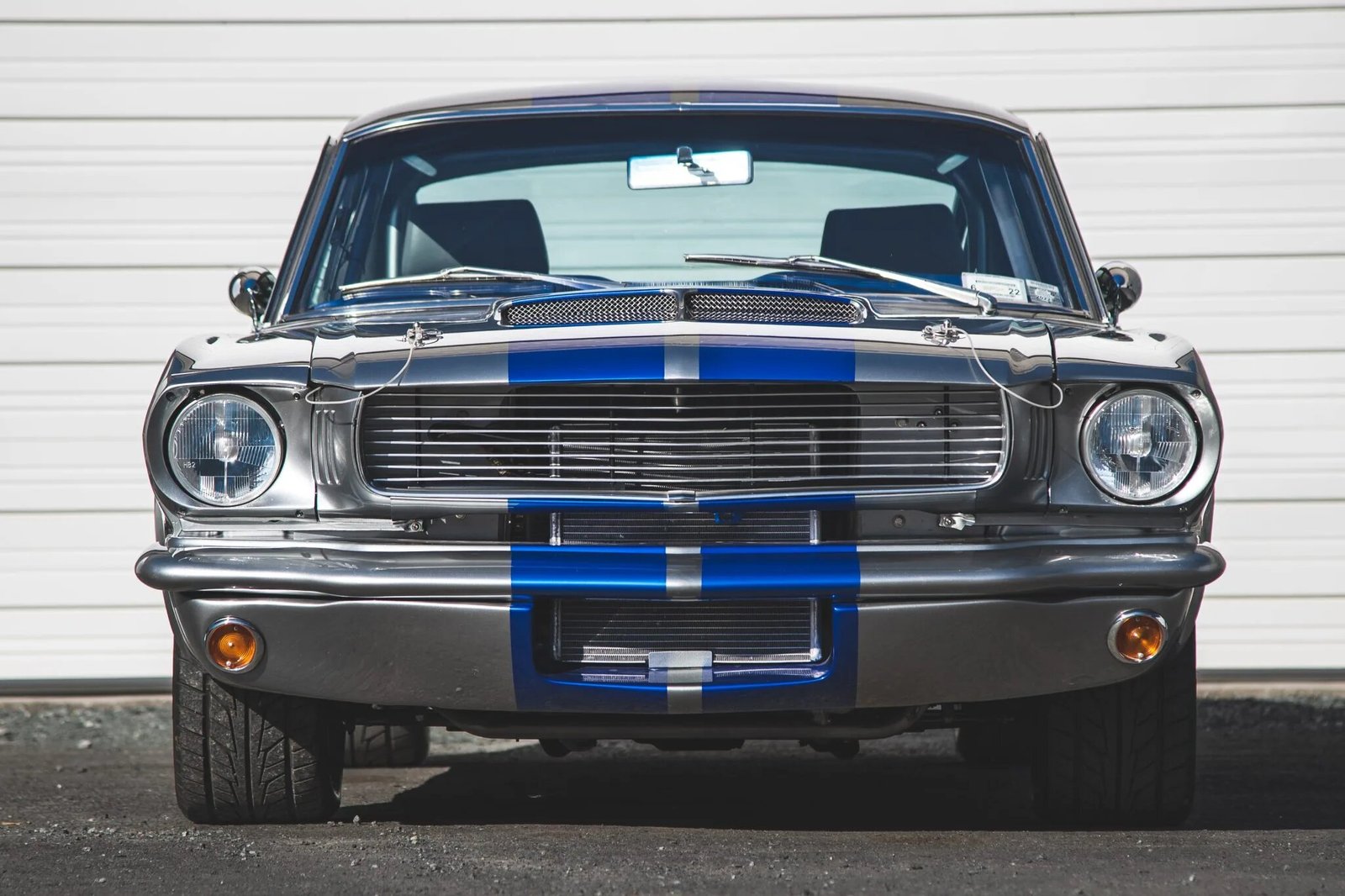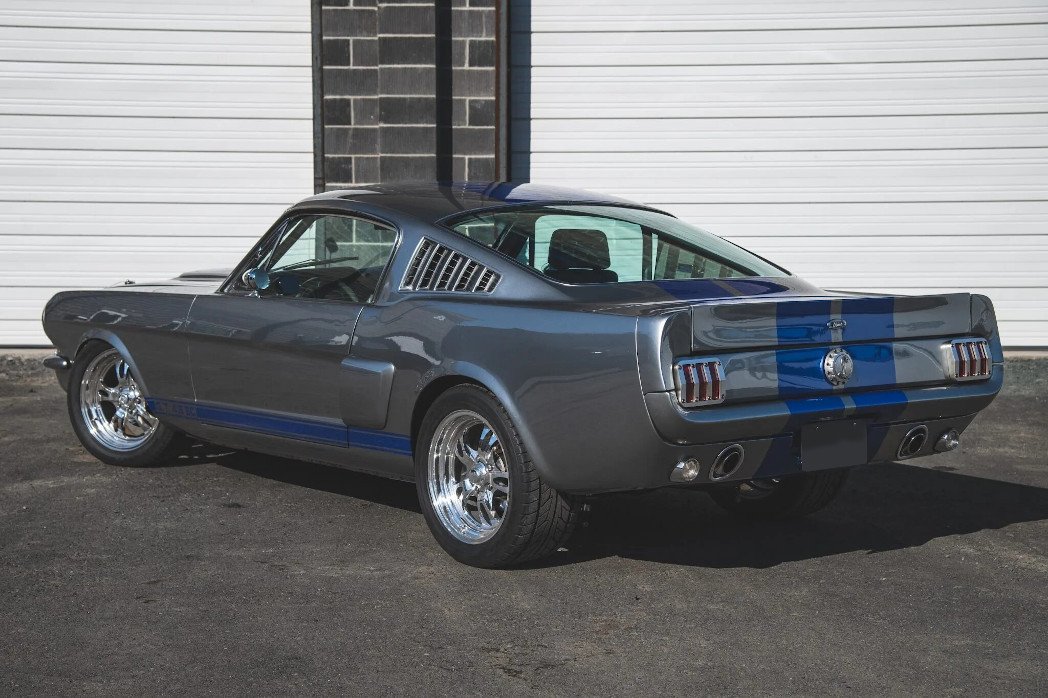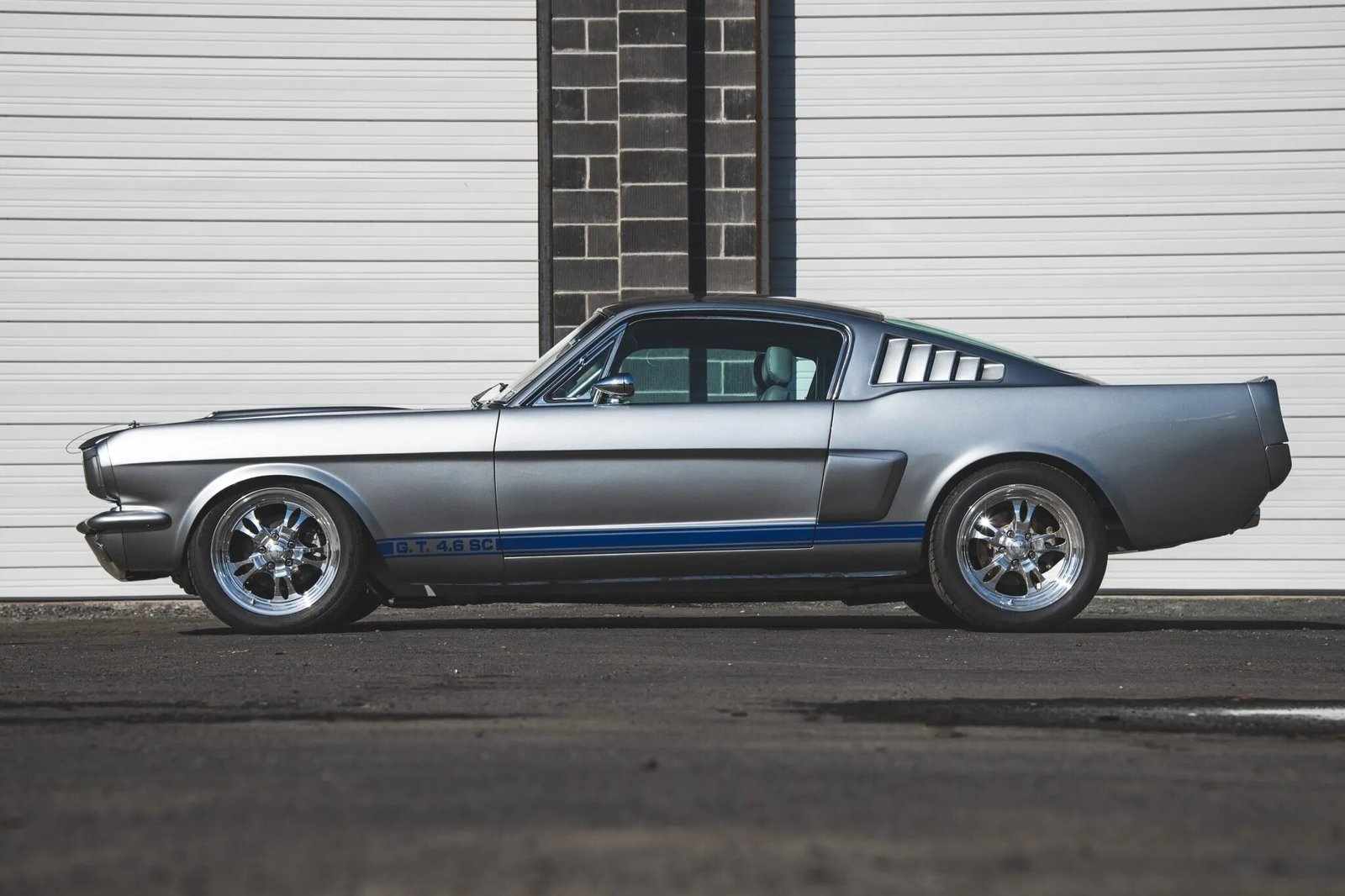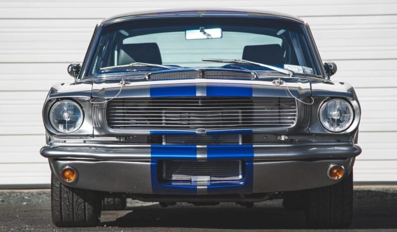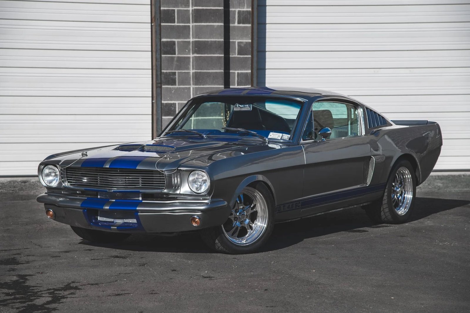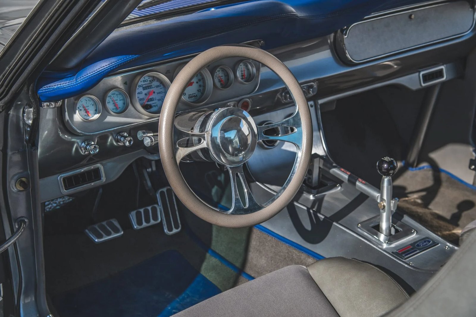 Modifications that included a refinish in gray with blue stripes and the installation of a supercharged 4.6-liter DOHC V8 mated to a Tremec five-speed manual transmission and a 9″ rear axle. The car is equipped with a triangulated four-link suspension system, four-wheel disc brakes, 17″ Billet Specialties wheels, HID headlights and taillamps, a stainless-steel fuel tank, a Detroit locker, long-tube exhaust headers, and Flowmaster mufflers. The interior was reupholstered in two-tone black and gray and features a Vintage Air HVAC system, a full-length center console, power windows, a short-throw shifter, a roll cage, and AutoMeter gauges.