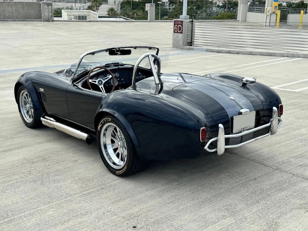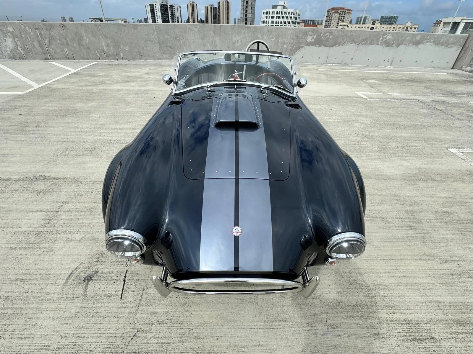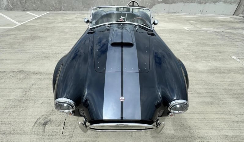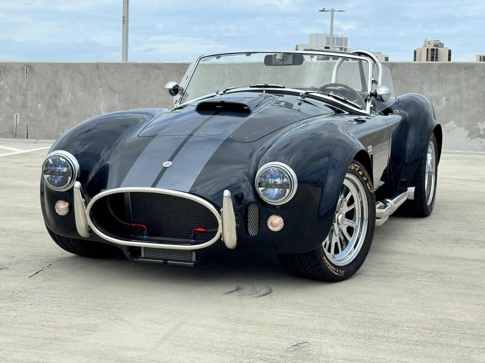 This Superformance MKIII Cobra replica is powered by a Roush Performance 427IR V8 equipped with an eight-stack intake and FAST fuel injection, and it reportedly produces 582 horsepower and 550 lb-ft of torque. Power is transferred to the independent rear end through a Tremec five-speed manual transmission and a ZF limited-slip differential with 3.45 gearing. The car also has knock-off Halibrand-style 17″ wheels, Cobra Valley R/T suspension, Wilwood disc brakes, polished stainless-steel side pipes, an aluminum radiator, Simpson harnesses, and Porsche Midnight Blue paintwork.