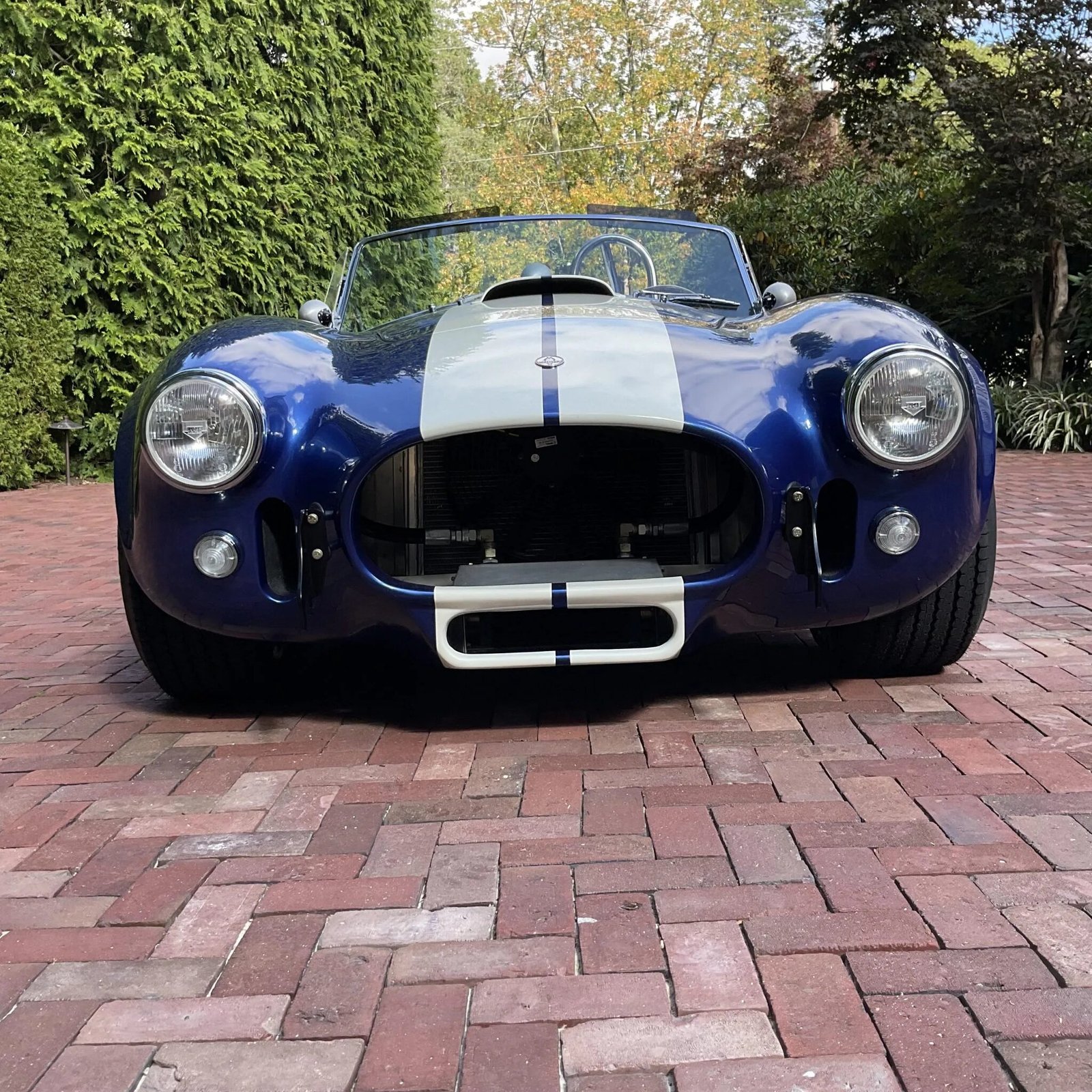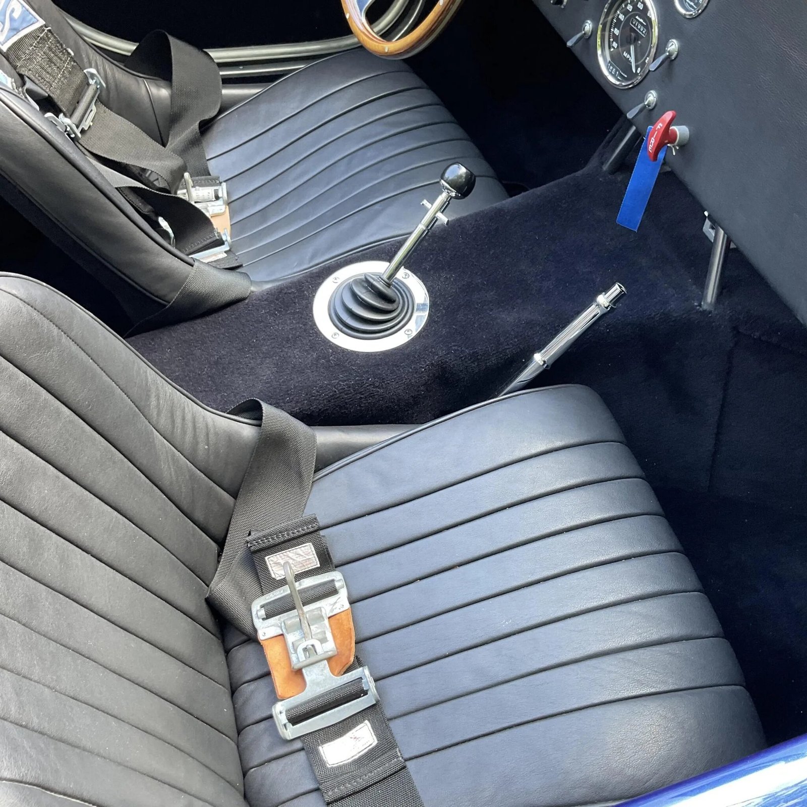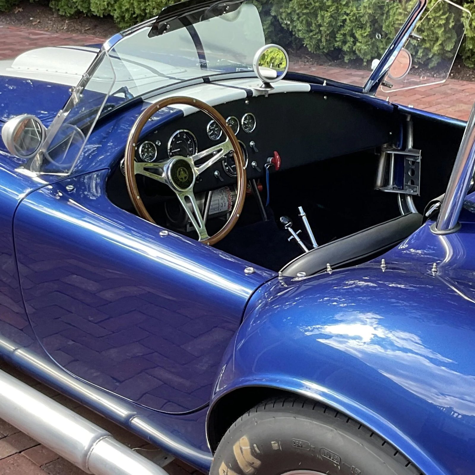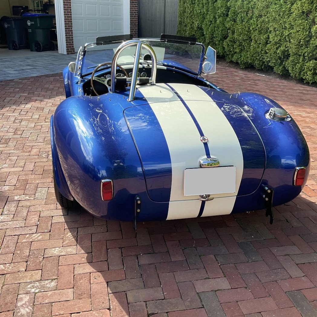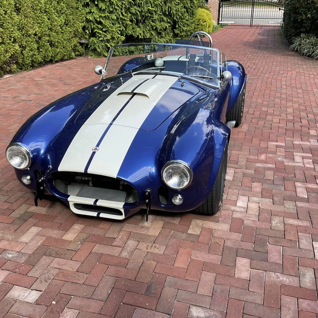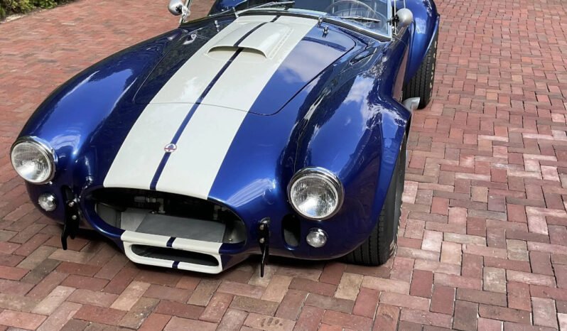 This Kirkham Motorsports 427/SC is powered by a Shelby aluminum-block 427ci V8 that has been stroked to displace 484ci, and it is paired with a four-speed manual transmission. Finished in blue with white stripes over black leather, the car features aluminum bodywork, a stainless-steel frame, 15″ Halibrand-style knock-off wheels, Wilwood four-wheel disc brakes, side-exit exhaust pipes, a roll bar, Stroud safety harnesses, dual Holley four-barrel carburetors, a Safecraft fire suppression system, and a wood-rim steering wheel.