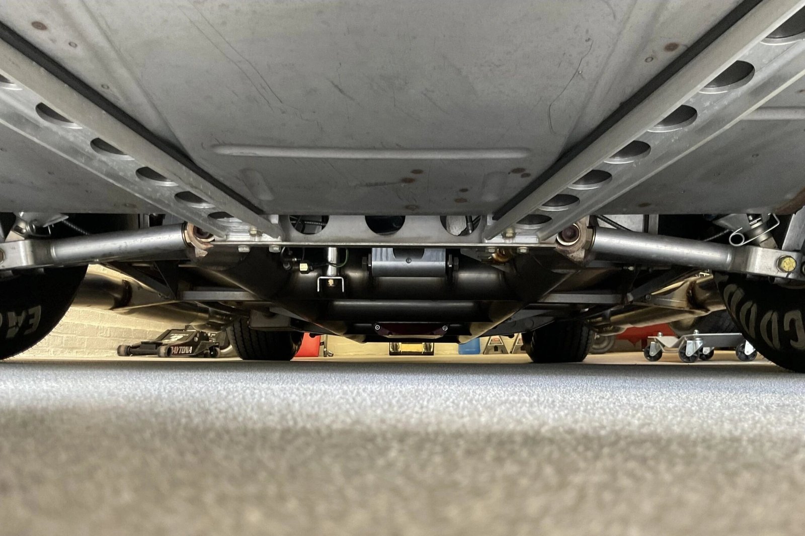 Power is sent to the rear wheels via a four-speed Ford Toploader manual transmission and an aluminum rear differential.