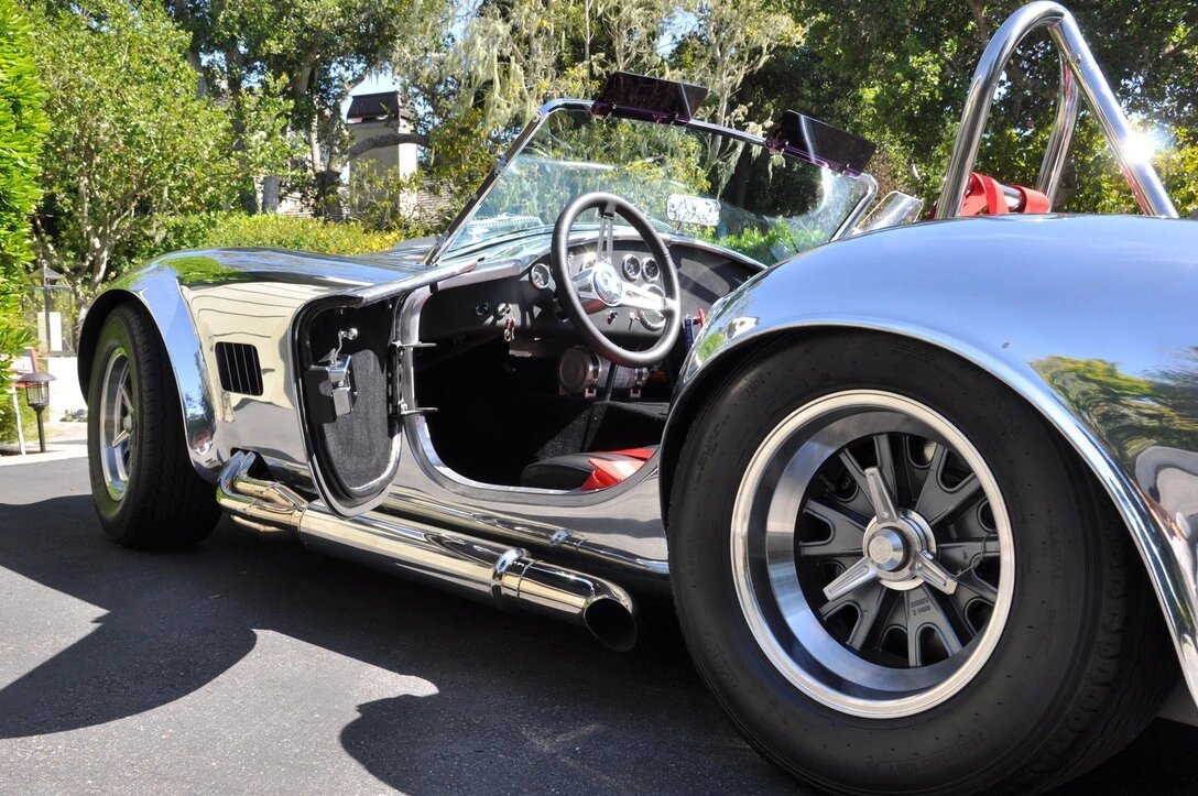 This Cobra features a powder-coated 4″ tubular chassis suspended by control arms and Penske coilovers with Hyperco springs at all four corners.