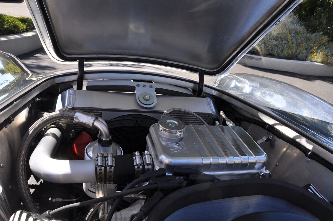 The 496ci V8 features Mahle alloy pistons, H-beam connecting rods, coated bearings, Shelby aluminum heads, and a single Holley 950HP carburetor housed within an aluminum turkey pan.