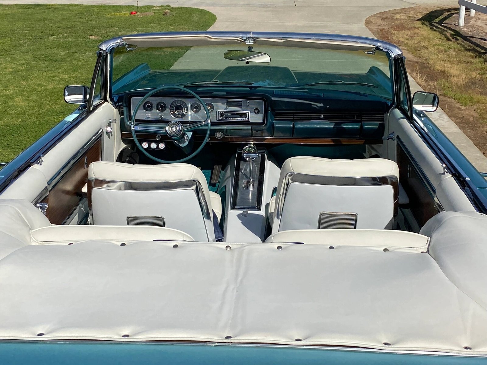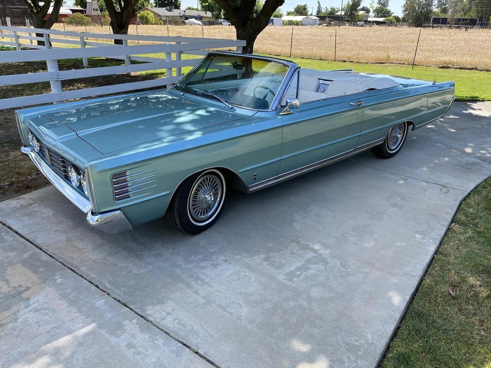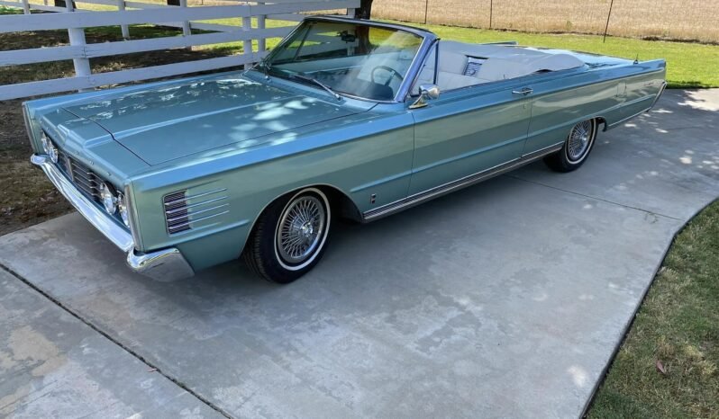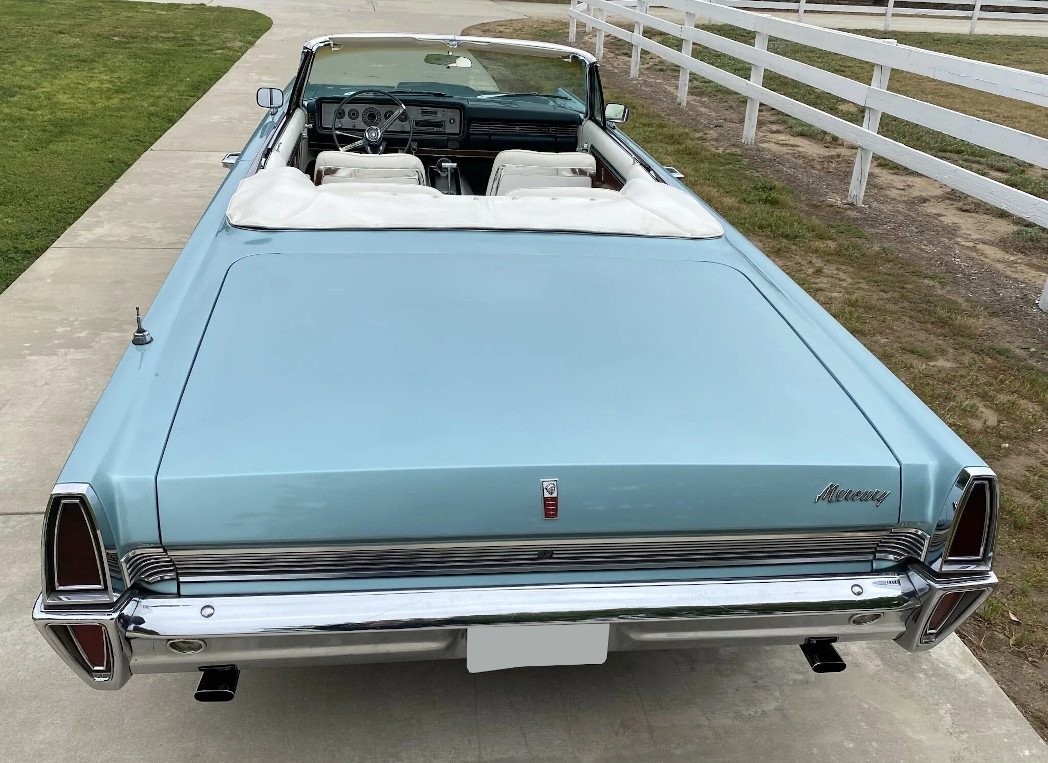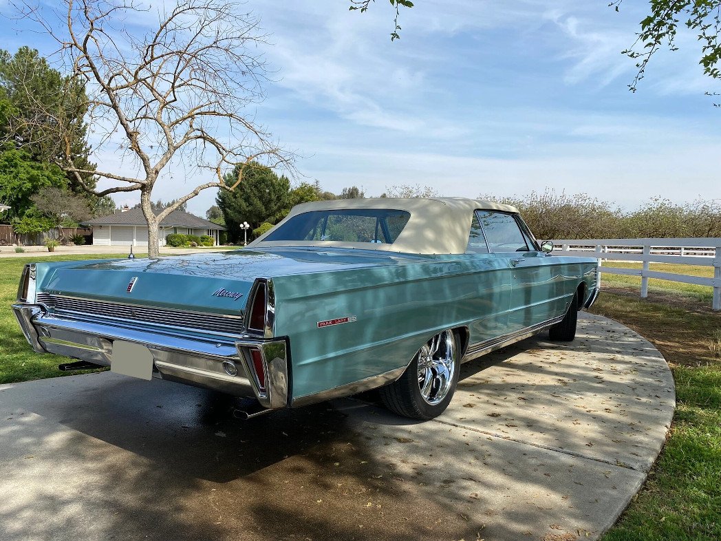 This 1965 Mercury Park Lane convertible is finished in turquoise over white and powered by a Z-code 390ci V8 paired with a three-speed automatic transmission.