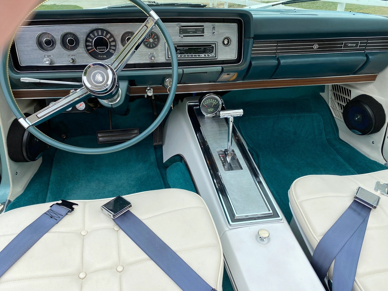 A Kenwood CD stereo is linked to aftermarket speakers fitted in the trunk and front footwells, and a trio of auxiliary gauges are mounted at the base of the dashboard.
