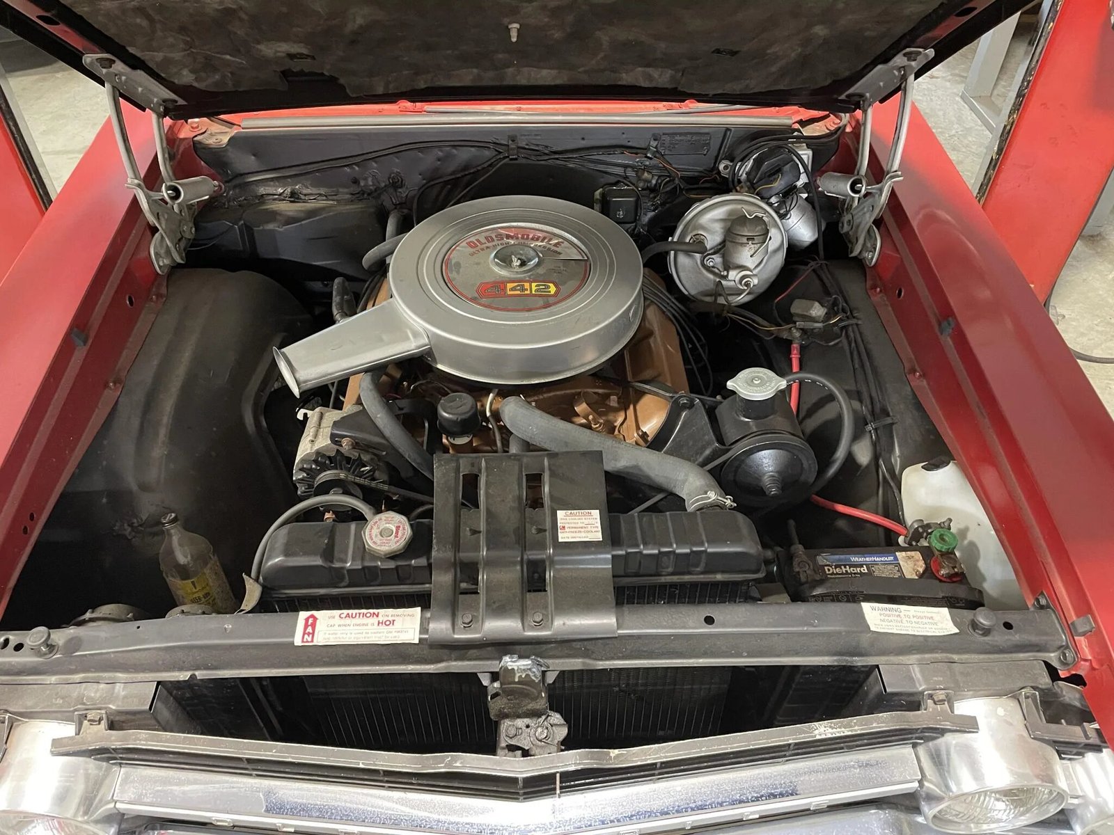 The 400ci V8 breathes through a four-barrel carburetor and features a 442-branded air cleaner cover.