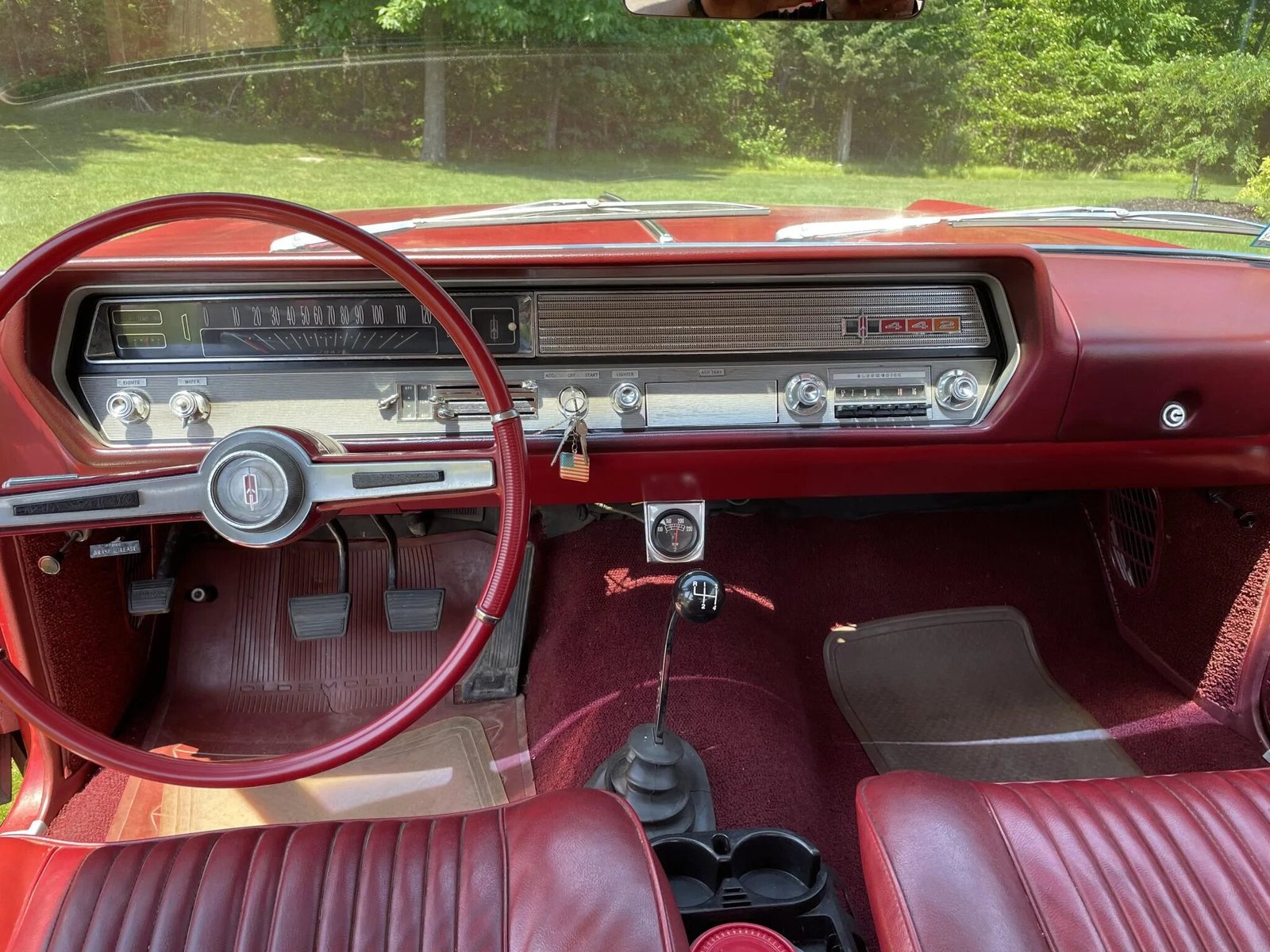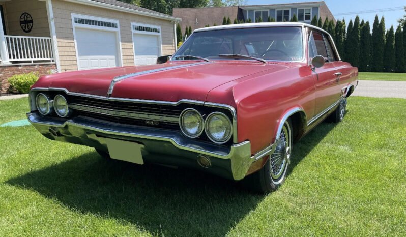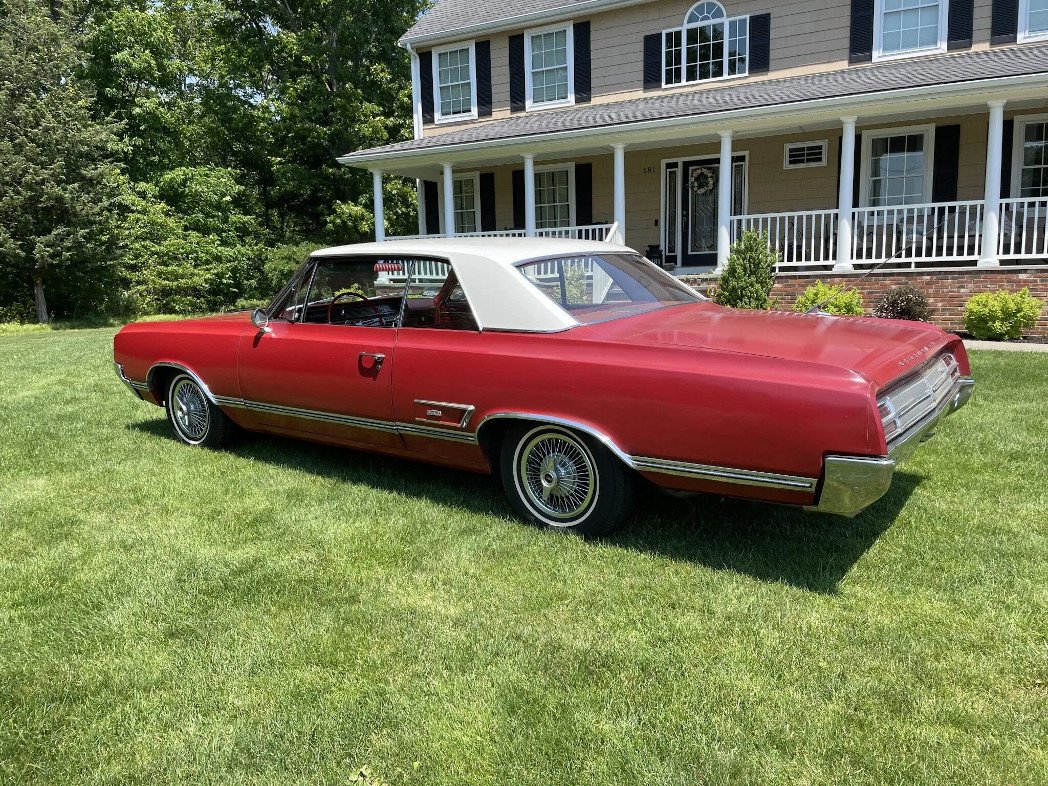This 1965 Oldsmobile Cutlass 442 coupe is finished in red and white over red and powered by a 400ci V8 paired with a four-speed manual transmission.