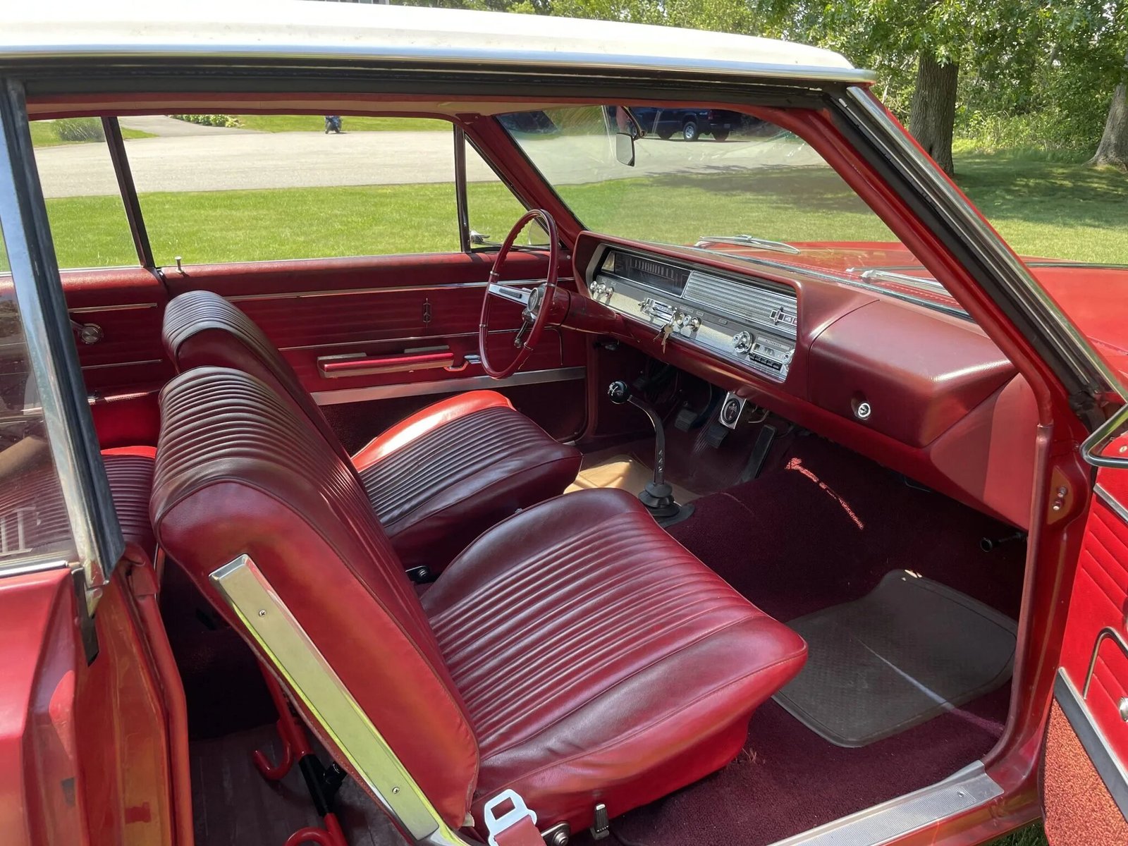 The cabin features front bucket seats and a rear bench upholstered in red vinyl joined by a matching dashboard and door panels.