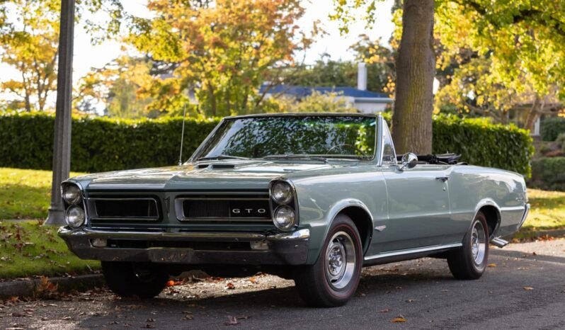 This 1965 Pontiac GTO convertible was refurbished by A&R Restoration. Refurbishment work consisted of rebuilding the engine, overhauling the chassis, repainting the body in Palmetto Green Metallic, and re-trimming the interior in black vinyl. The car is powered by a 389ci V8 fitted with triple Rochester two-barrel carburetors and linked with a Muncie four-speed manual transmission. Equipment includes a black convertible top, power steering, power front disc brakes, 14″ Rally I wheels, a center console, a digital stereo, woodgrain trim, and a dual exhaust system.