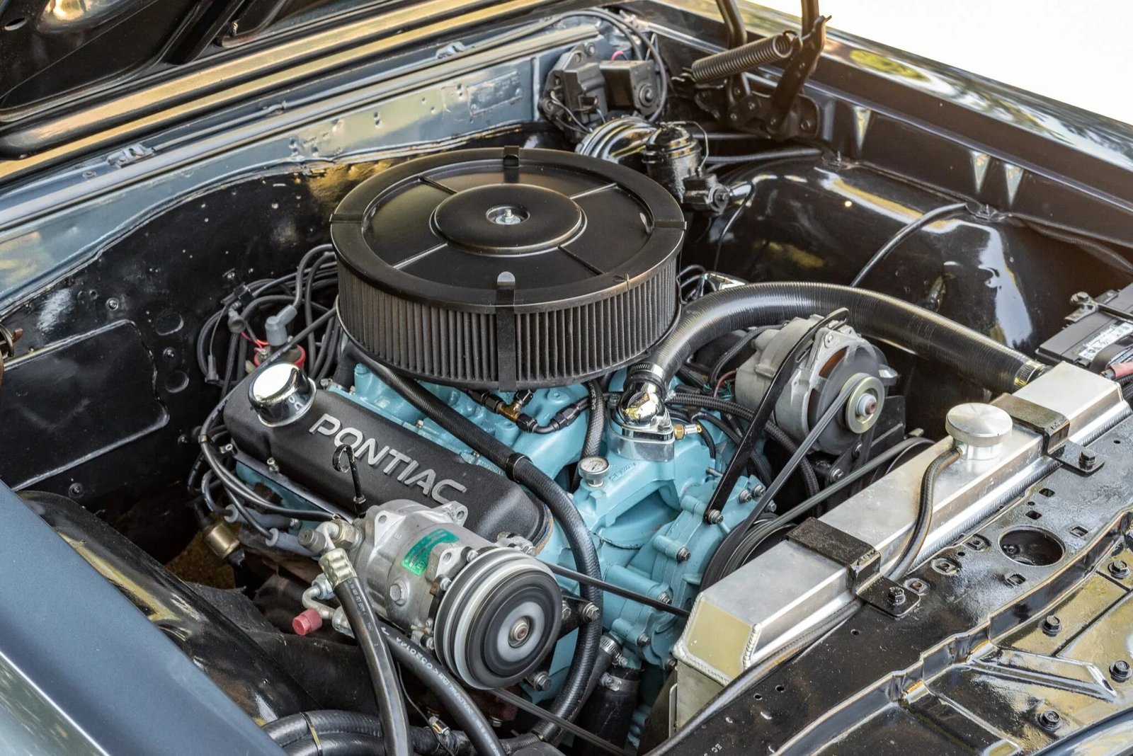 The replacement 389ci V8 have been rebuilt and bored .060″ by B&B Automotive Specialties and fitted with the following components: Holley 850-cfm spread bore double-pumper carburetor, High-rise intake manifold, Ram Air exhaust manifolds, Keith Black Icon forged pistons, Crower 278H camshaft, Melling high-volume oil pump, Machined cylinder heads, Crane Cams valve springs, Vinton steel-clad valve seals, Roller rocker arms, Stainless steel valves, ARP fasteners, RobbMc Performance fuel pump, MSD distributor and electronic ignition, Aluminum radiator with dual Spal thermostatic fans, Replacement harmonic balancer, water pump, engine mounts, and vacuum canister, Stainless steel fuel tank and lines.
