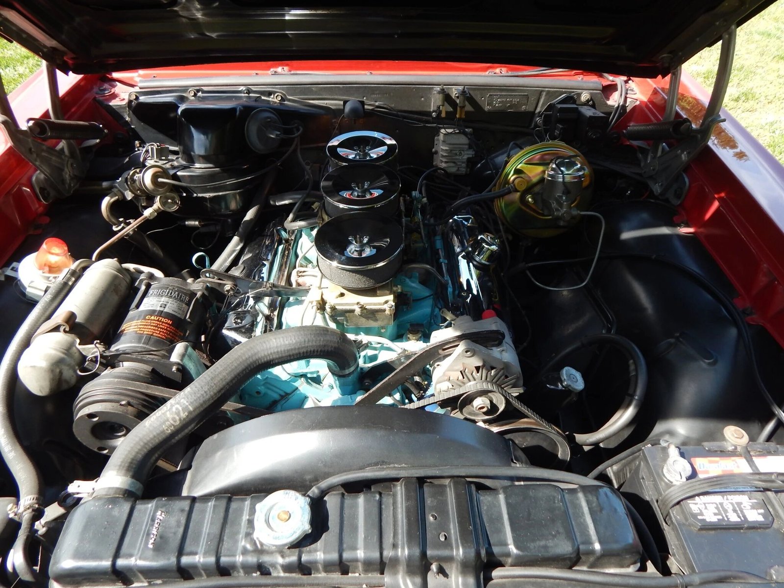 The interior is finished in matching red and features a number of factory optionsp: Air Conditioning, Power steering, Power brakes, Power windows front and rear, Power driver’s seat, AM/FM push button radio with power antenna, Reverb unit, Rear speaker, Remote trunk release, Remote driver’s side mirror, Padded dash, Tilt steering wheel, Tinted side glass, Retractable lap belts, Console vacuum gauge.