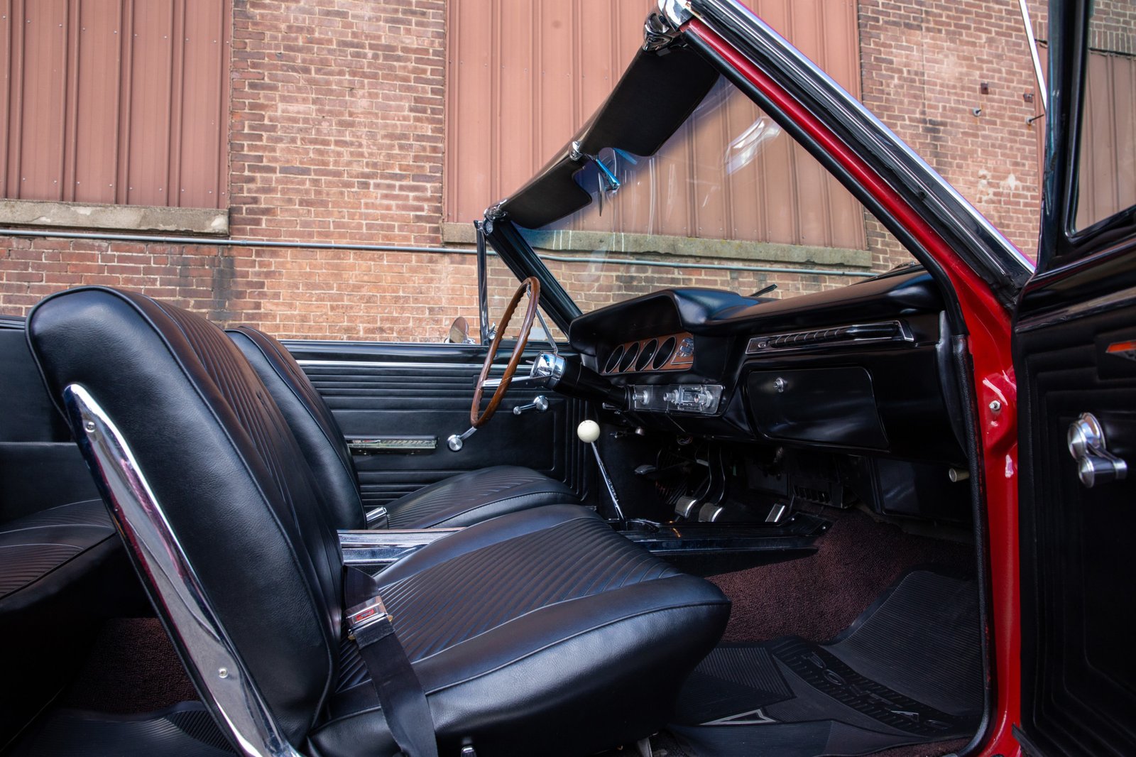 A full-length center console holds a Hurst shifter, and a period-style AM/FM radio has been added to the dash.