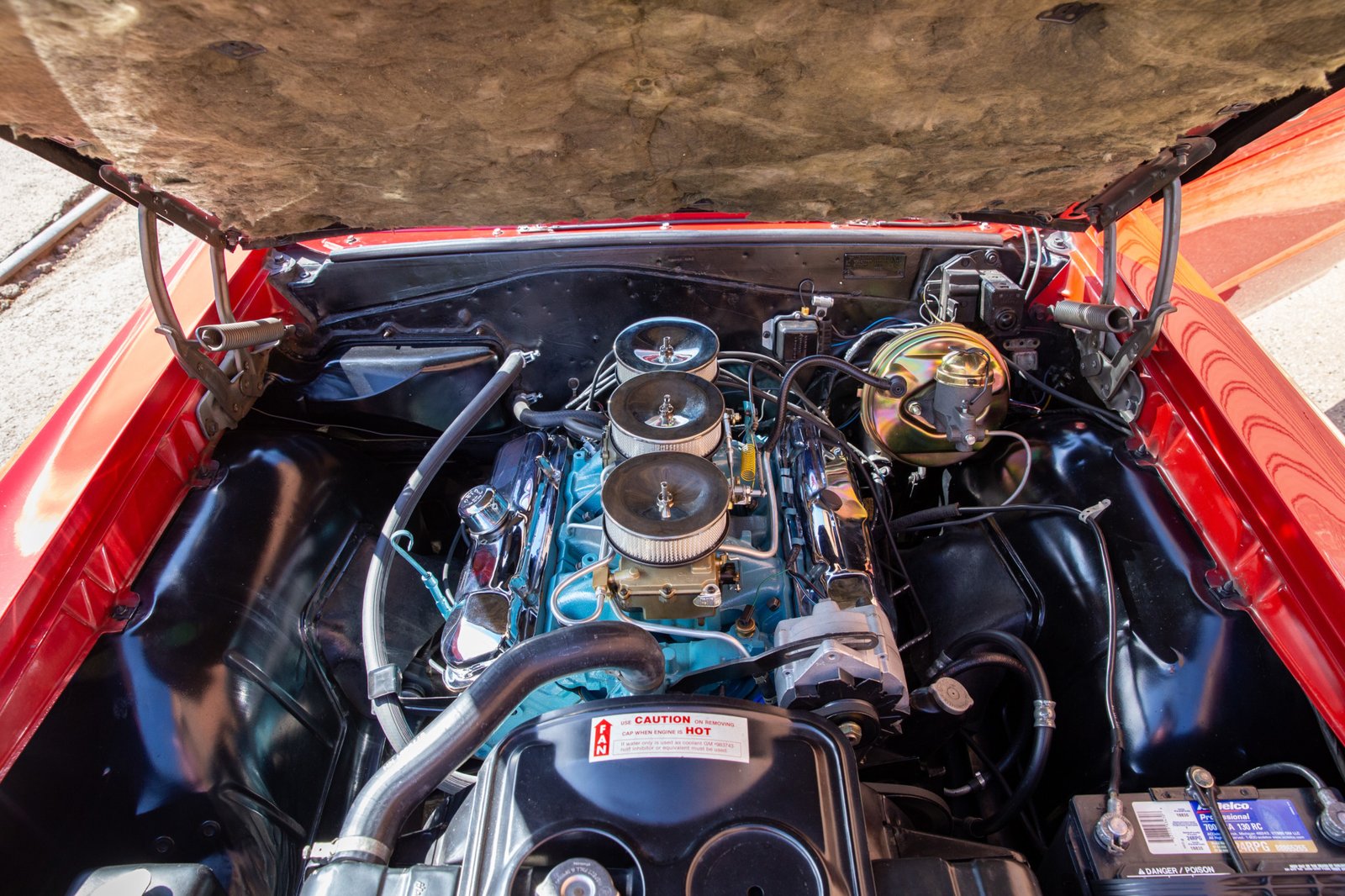 The WS-code 389ci V8 features Tri-Power induction, with three two-barrel Rochester carburetors on a specific intake manifold.