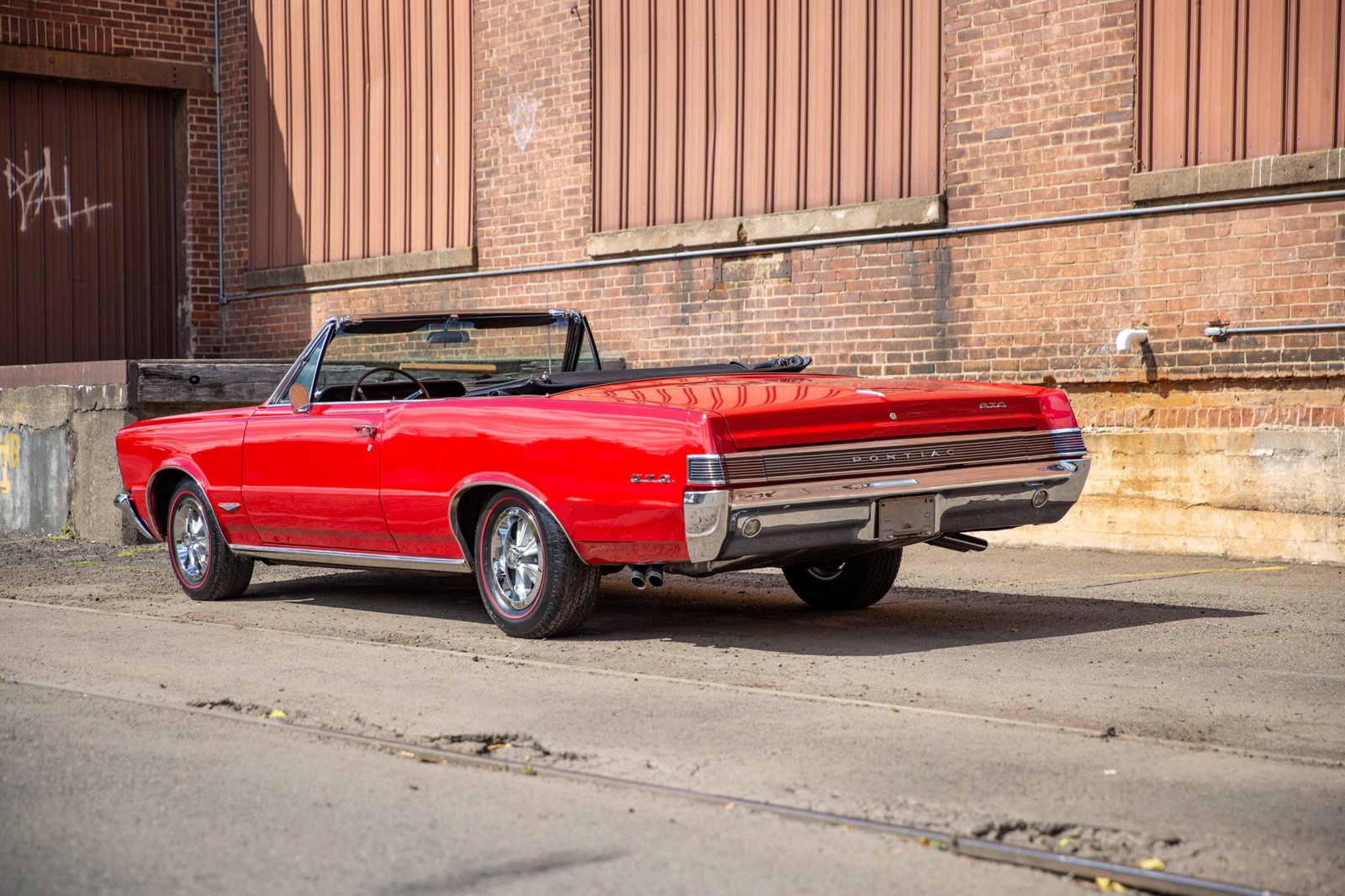 The exterior features a hood scoop, GTO badges, and a black soft top which is photographed in its raised and lowered positions.