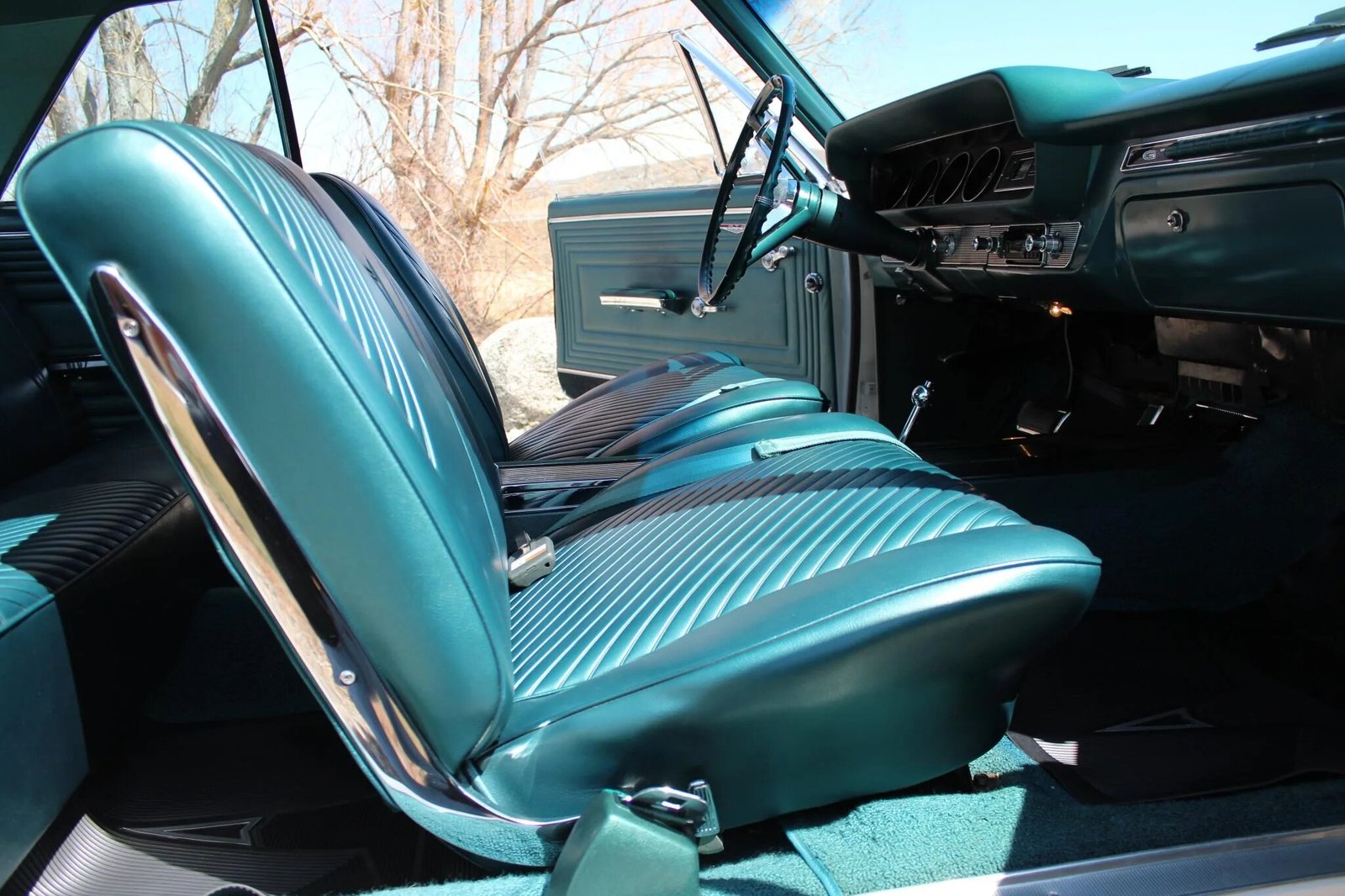 The front bucket seats and rear bench are trimmed in Turquoise vinyl, and the cabin features a matching dash, replacement carpets, and door panels.