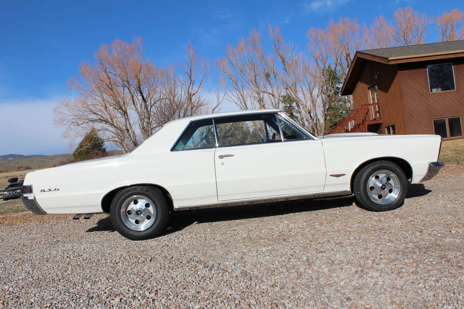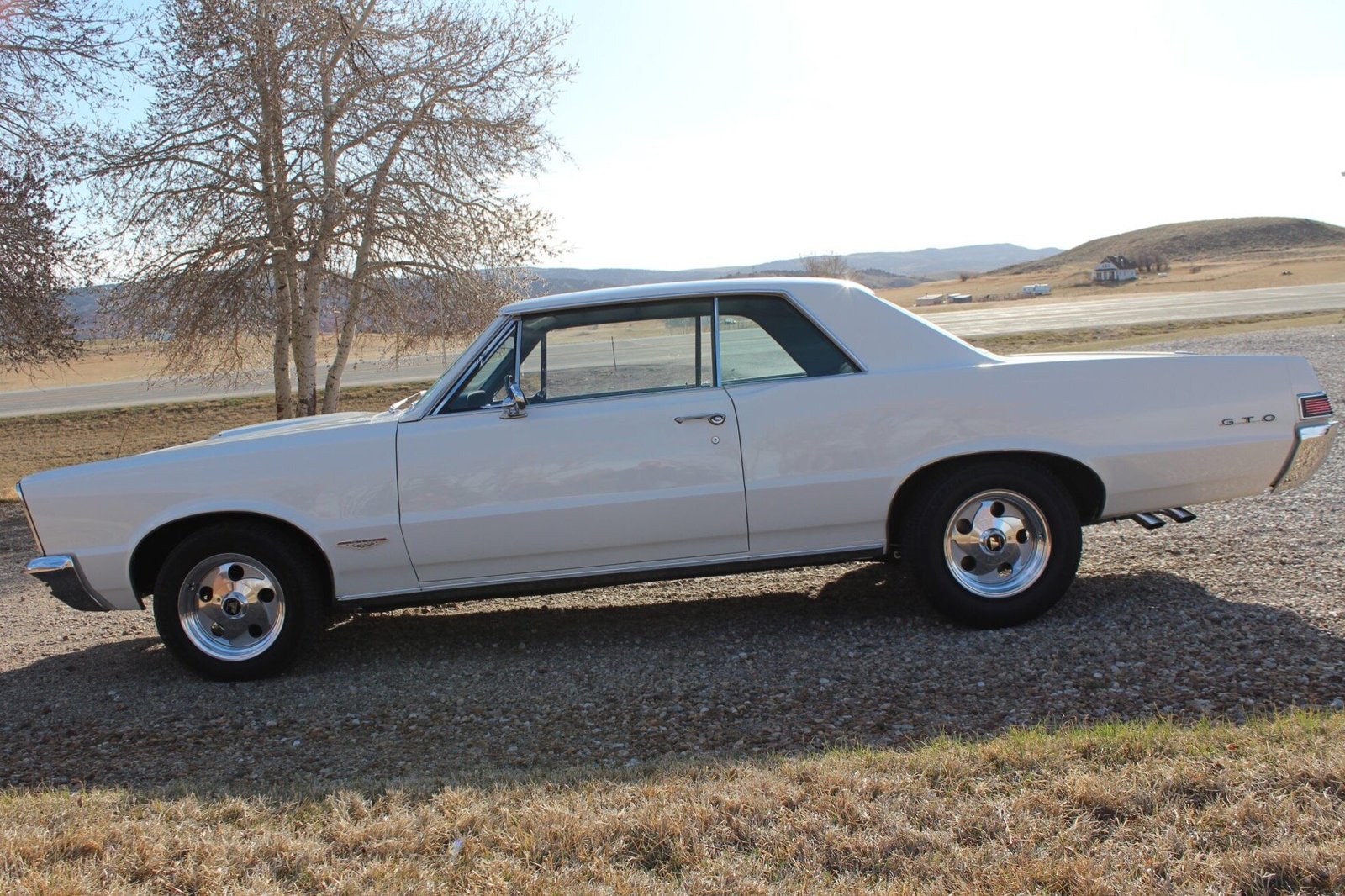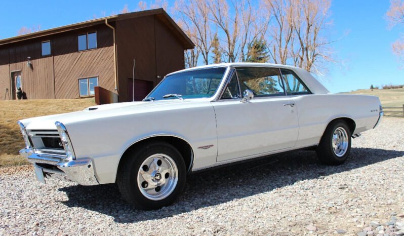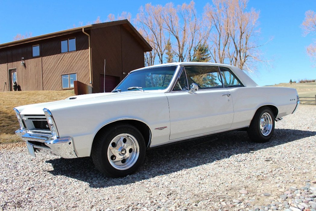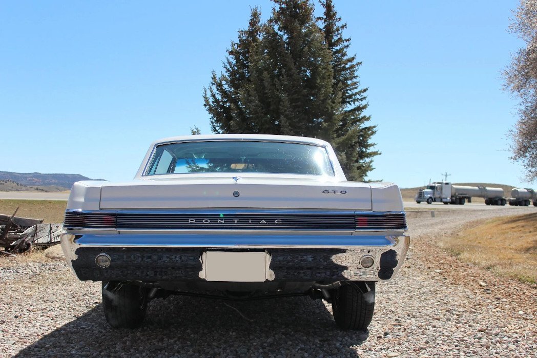 Exterior equipment includes a hood scoop, a side mirror for the driver, chrome bumpers, stacked quad headlamps, and GTO badging.
