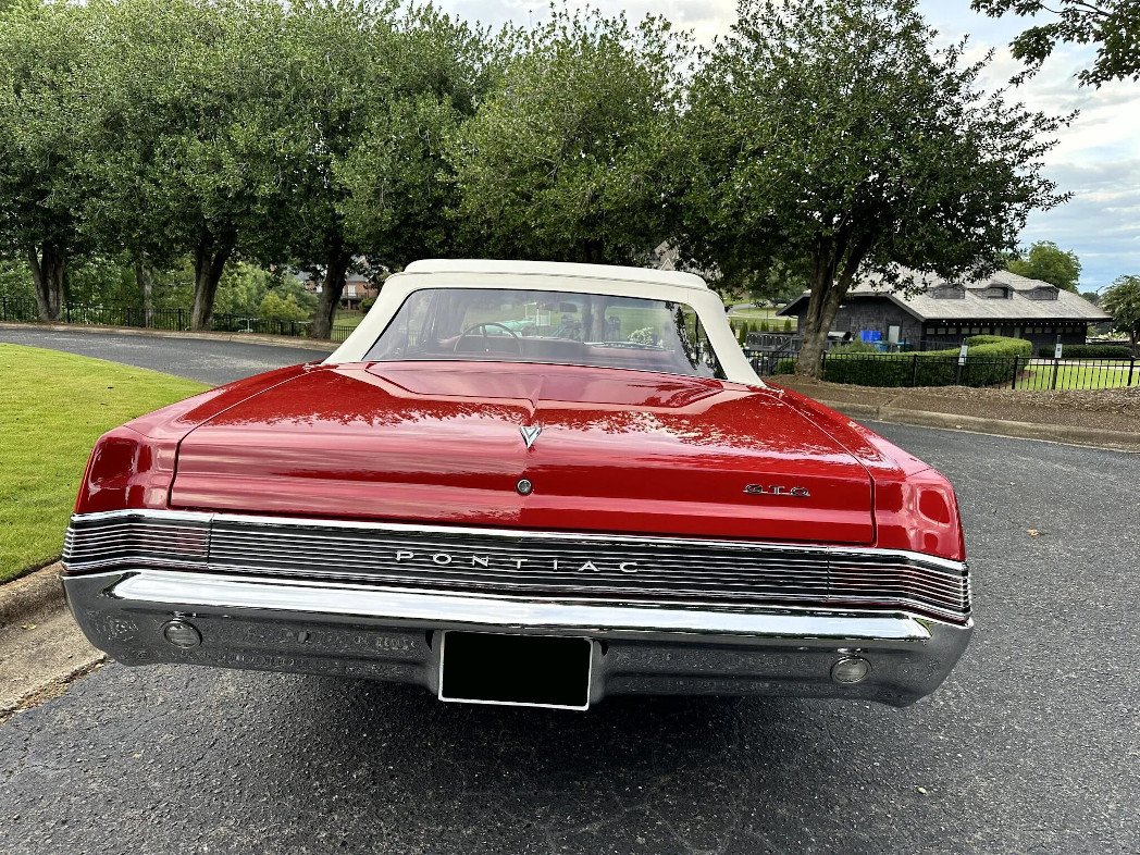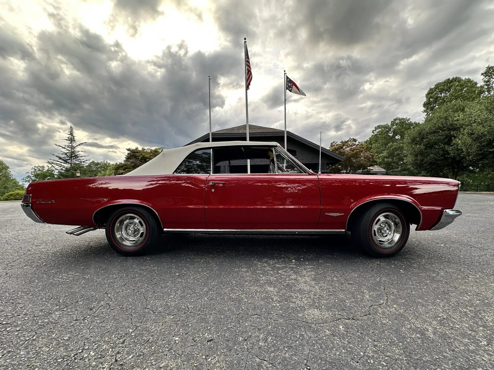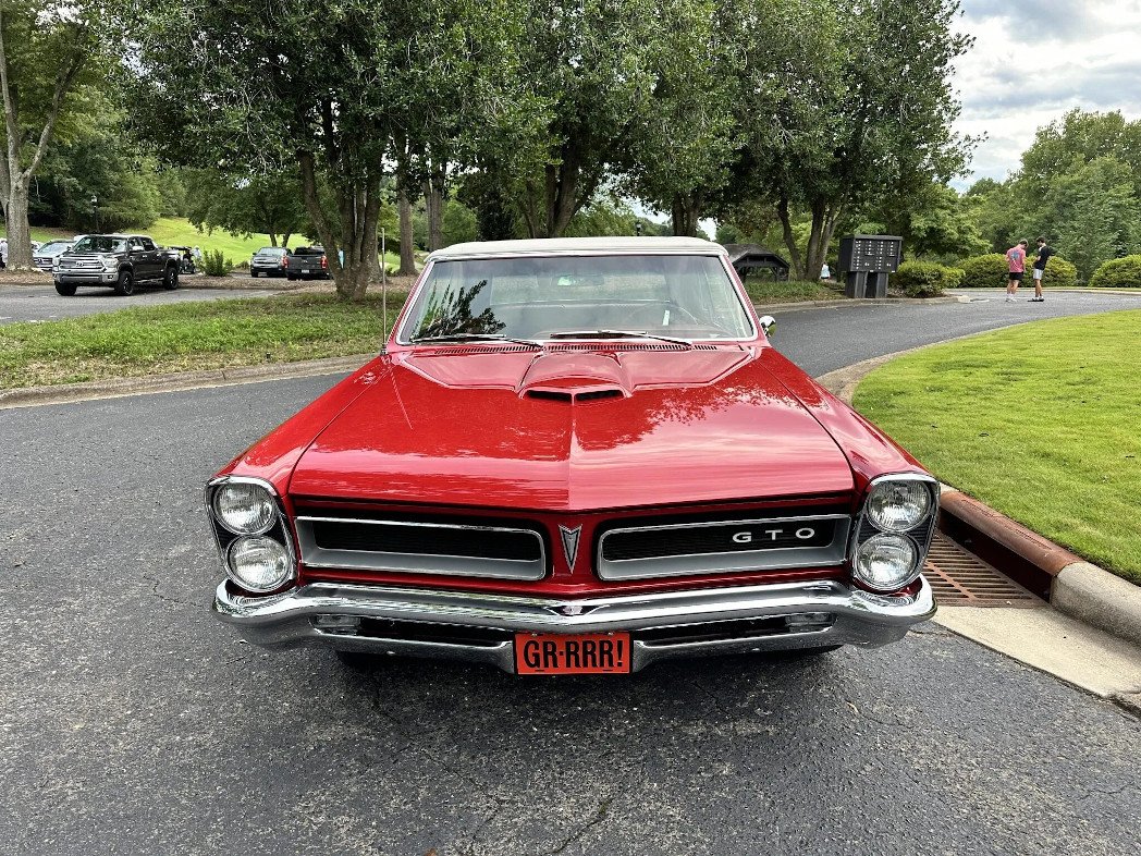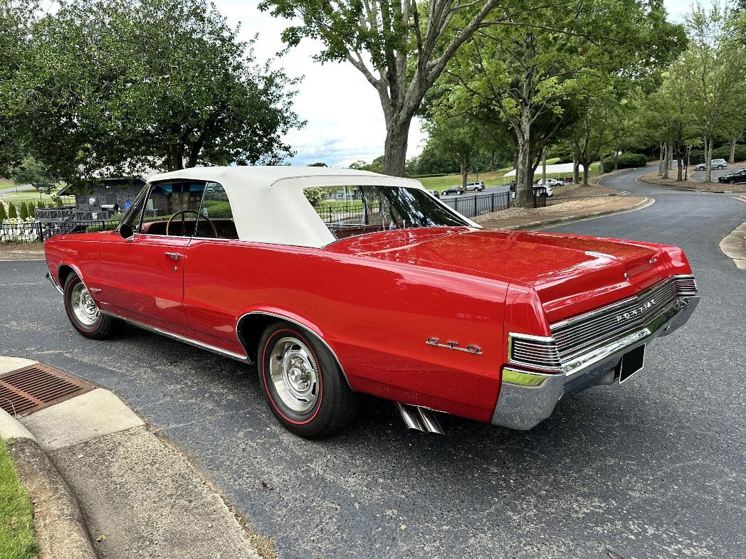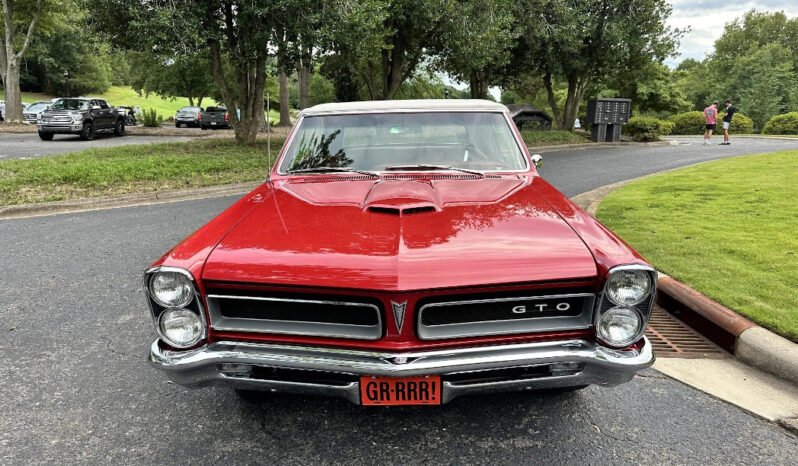 This 1965 Pontiac GTO convertible was originally delivered to Brown Motor Sales, and received a body-off restoration in 2006. Work in 2023 included replacing the engine short block due to a failed camshaft as well as installing KYB shocks and Redline Radial tires. It is finished in Montero Red over red vinyl and is powered by a 389ci V8 with a Tri-Power induction setup linked with a four-speed manual transmission and a 3.55:1 limited-slip differential. Equipment includes a white convertible top, power steering, power-assisted brakes, 14″ Rally wheels, a rear bench seat, an AM radio, a Hurst shifter, and a heater.
