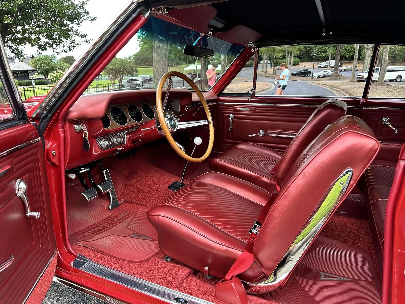 The refurbished interior houses front bucket seats and a rear bench upholstered in red vinyl (207) along with a color-coordinated dashboard, door panels, and carpeting. Amenities include an AM radio, a glovebox storage light, Pontiac-branded rubber floor mats, and a heater.