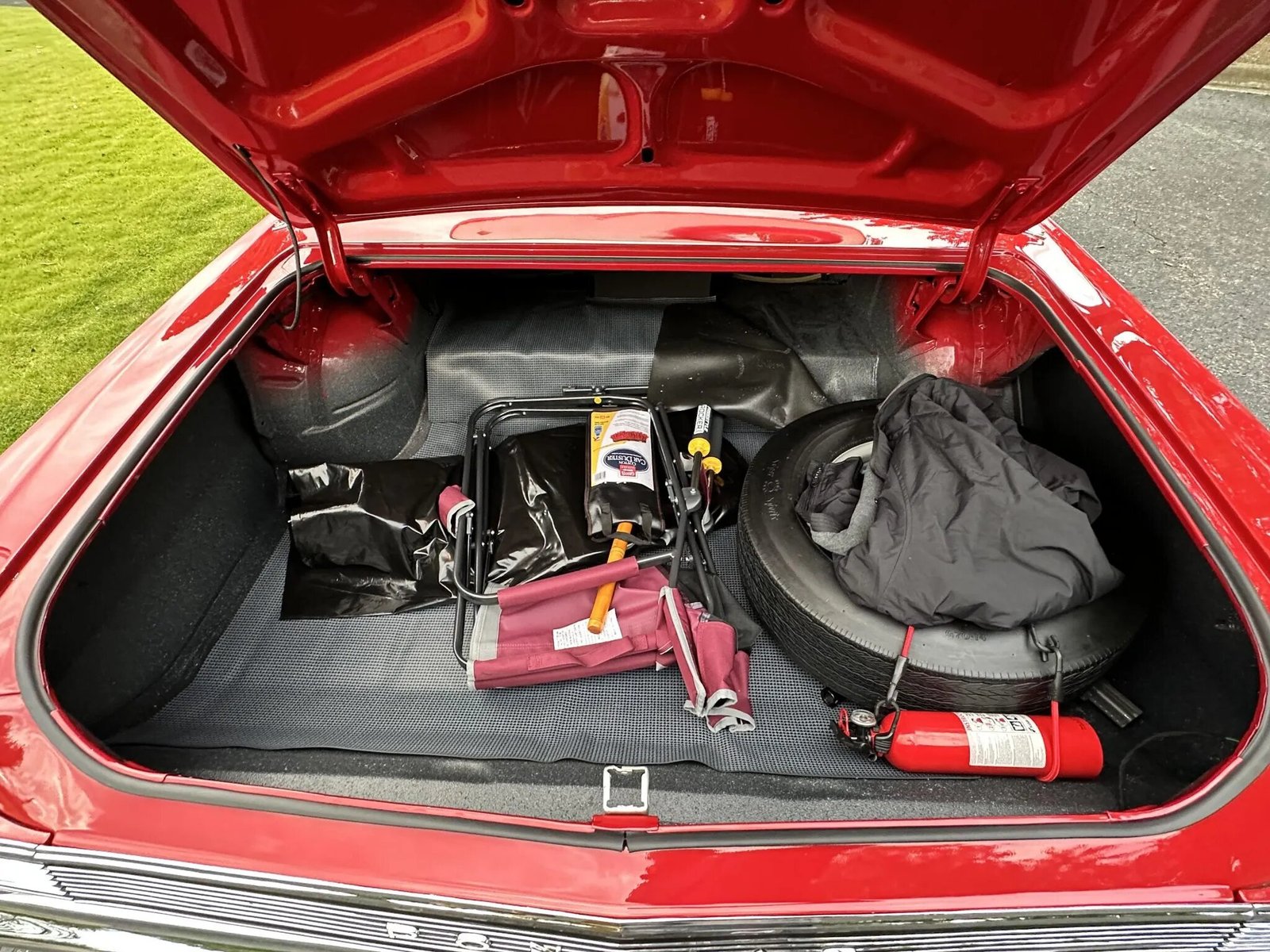 The 14″ Rally wheels are mounted with Firestone Wide Oval Radial redline tires. The car is equipped with power steering, and braking is provided by power-assisted brakes drums at each corner. Front and rear KYB shocks were installed in June 2024. A set of four bias ply Redline tires and OEM-style shocks are included in the sale.