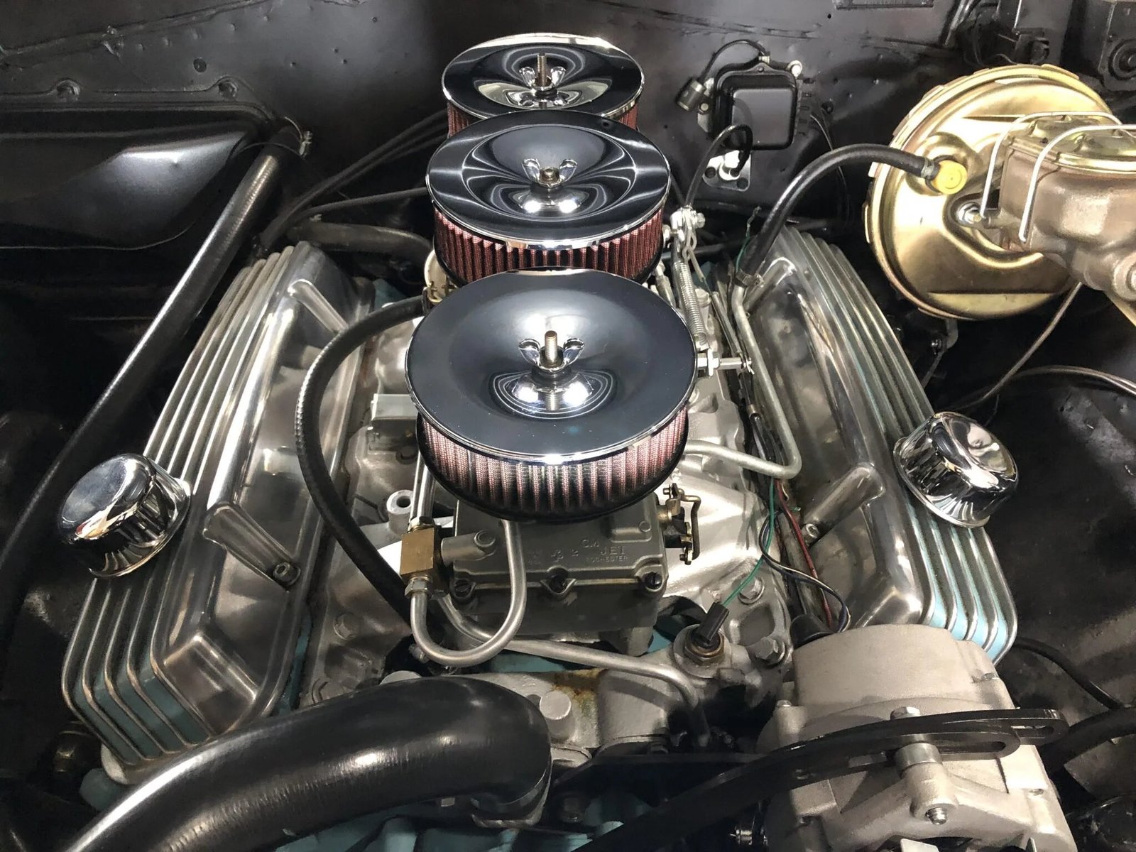 A replacement wiring harness was installed, and additional equipment includes a tri-power intake manifold, rebuilt carburetors, an aluminum radiator, ceramic-coated Doug’s headers, and a mandrel-bent 2.5″ Pypes exhaust system with Race Pro mufflers.