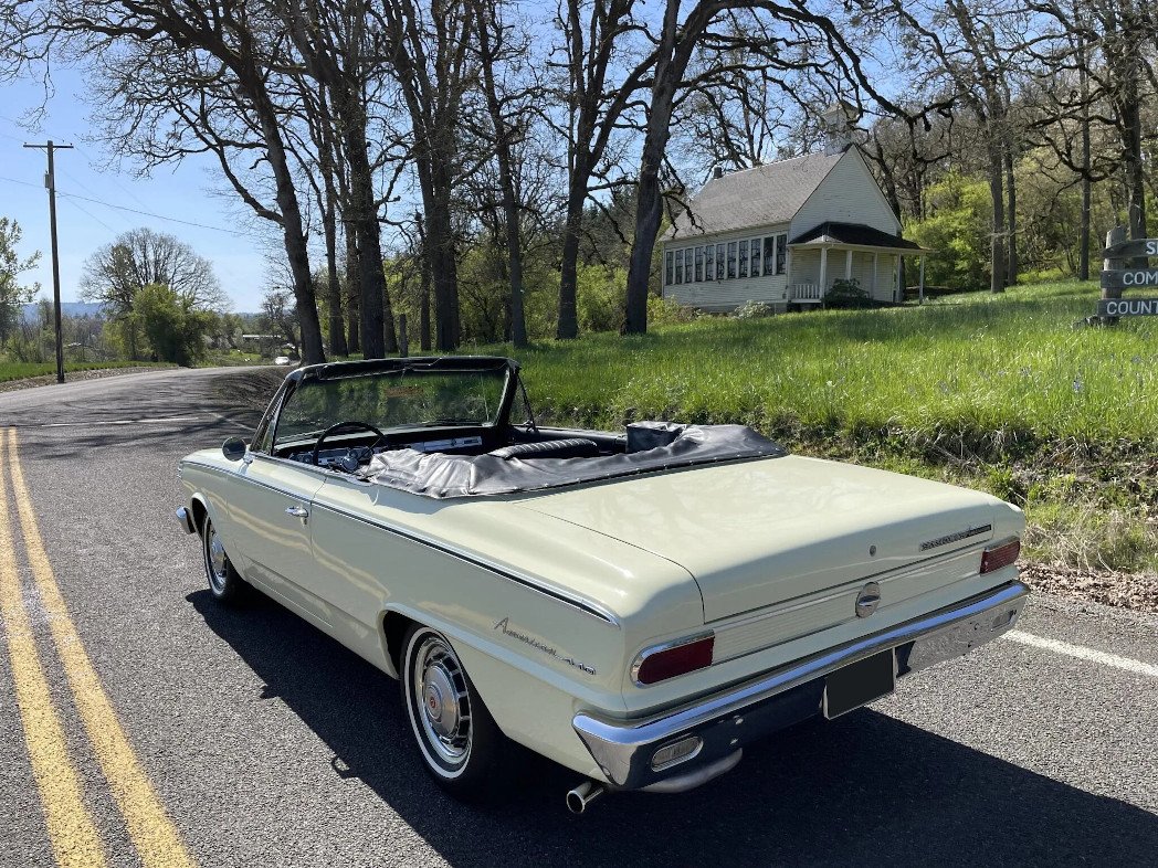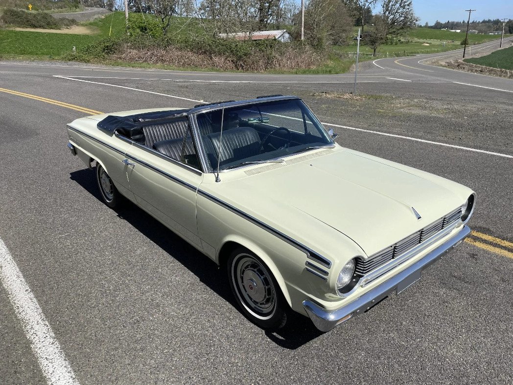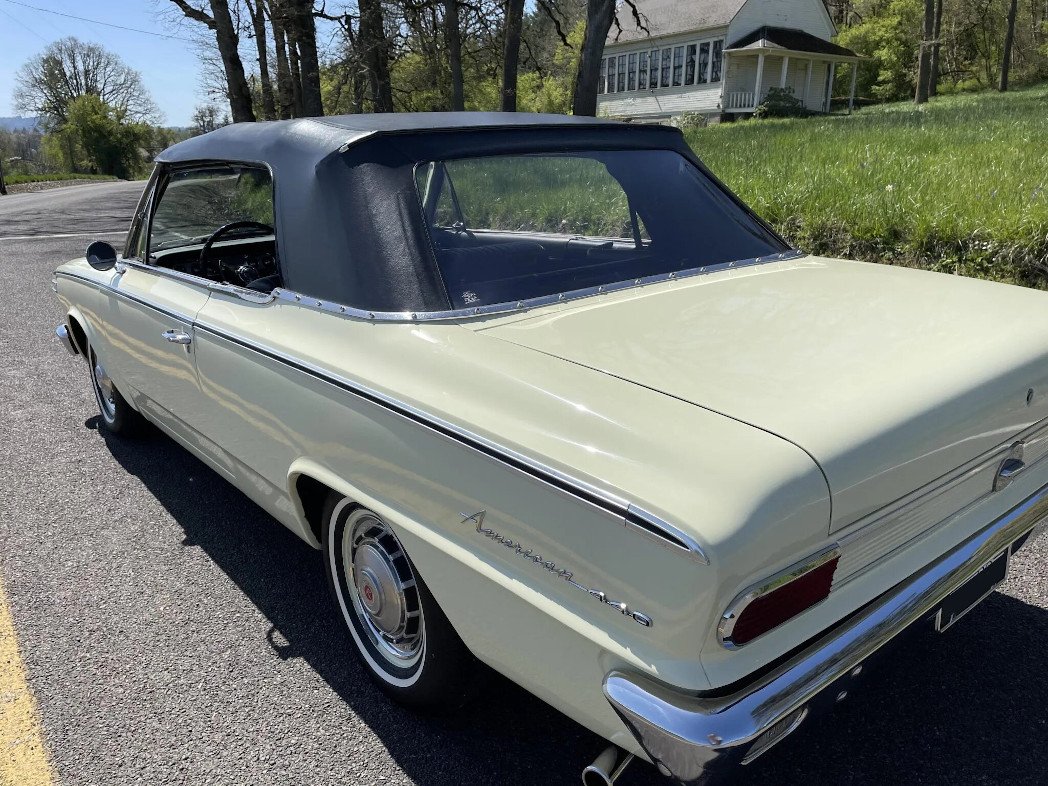 This 1965 Rambler American 440 is a two-door convertible that has been refinished in yellow over black and is powered by a 196ci inline-six paired with a column-shifted three-speed manual transmission.