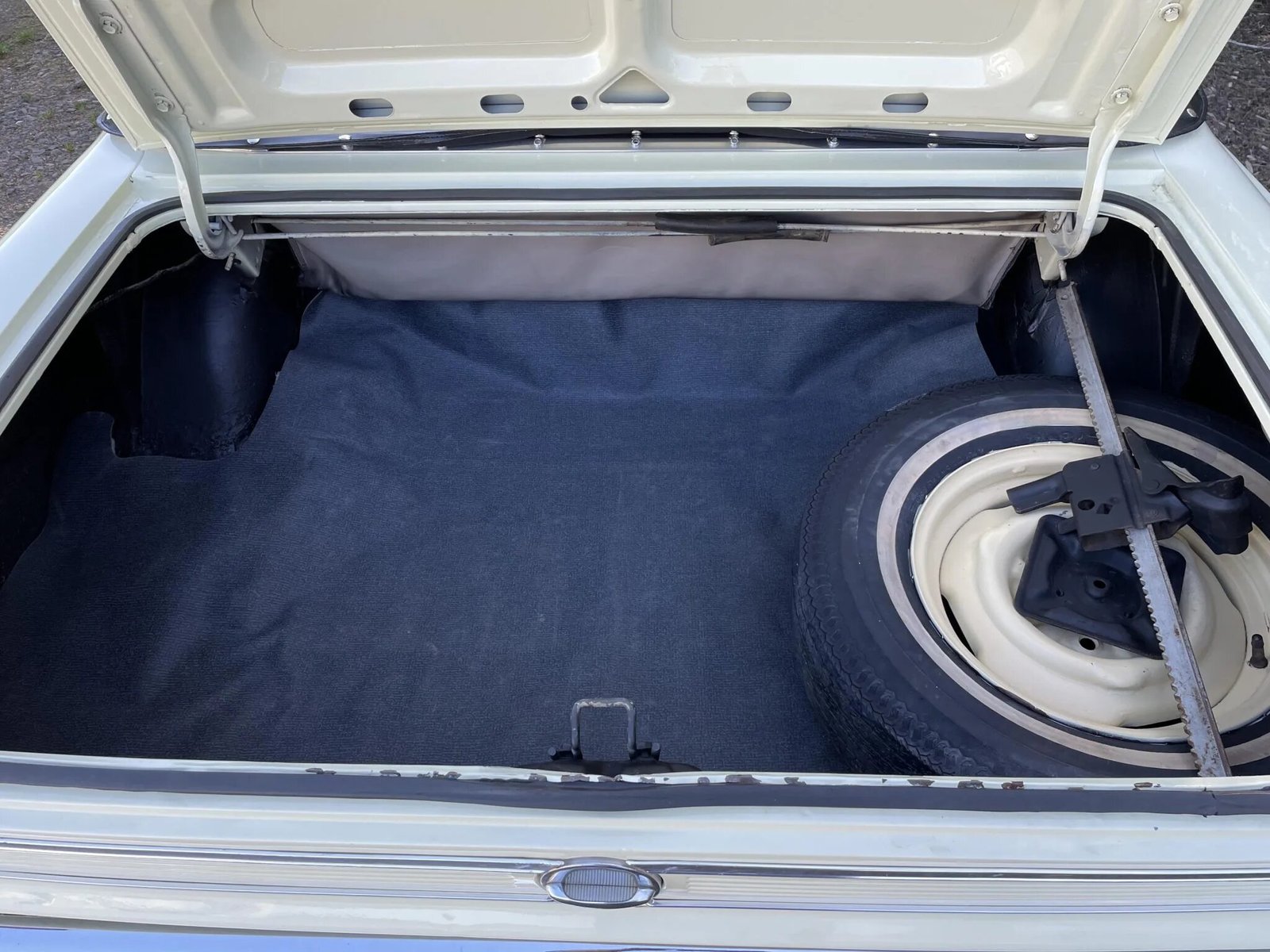 Body-matching 14″ steel wheels wear Rambler-branded covers and are mounted with 195/75 Multi-Mile PR812 radial whitewall tires.