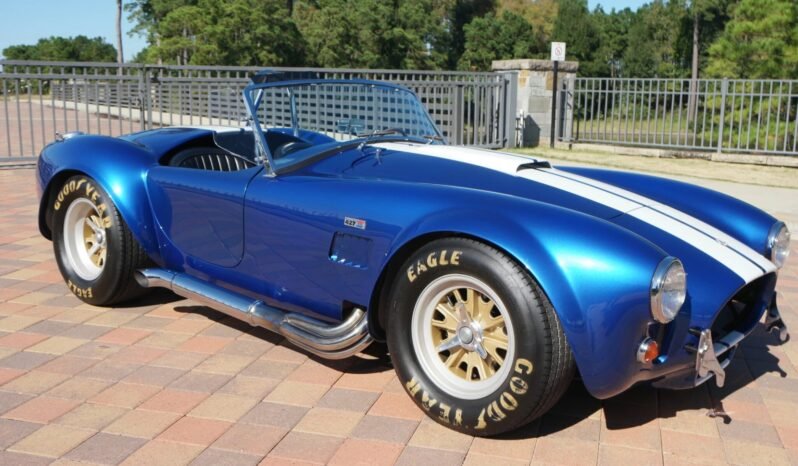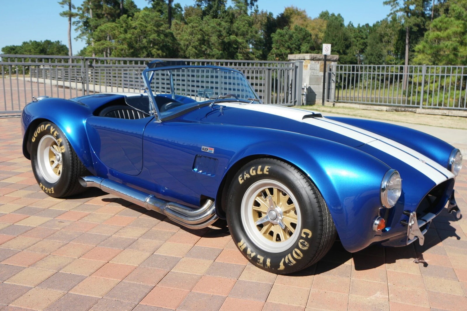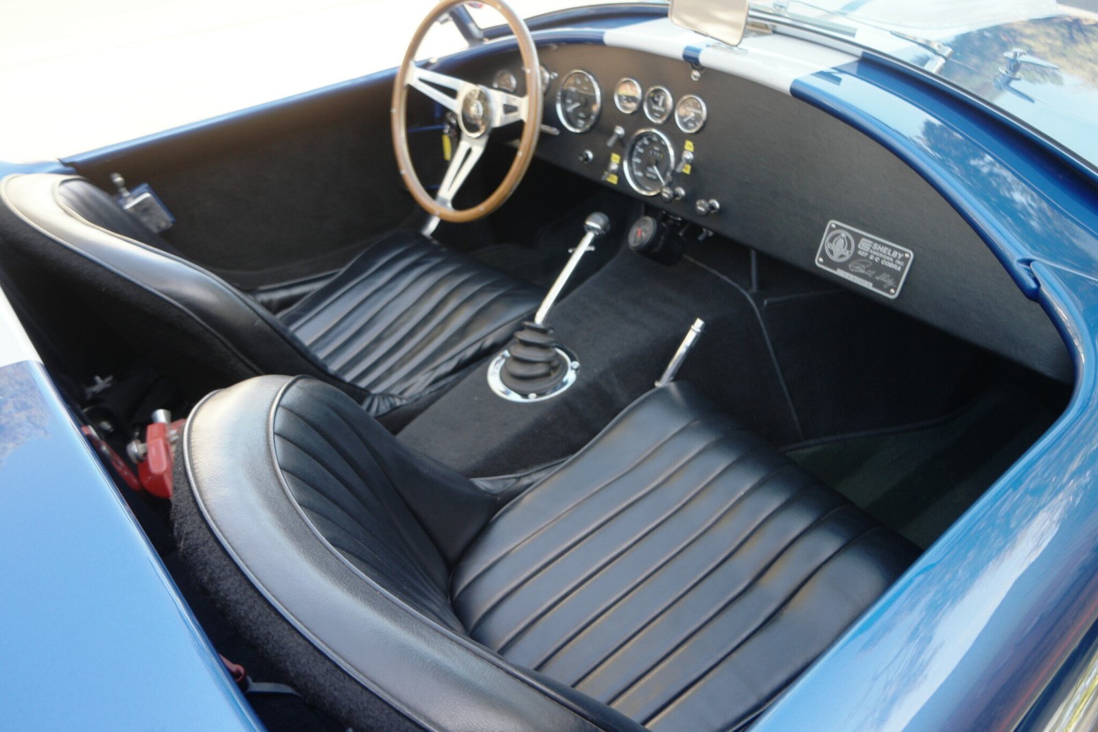 The fiberglass body is finished in Guardsman Blue, an original Cobra color, and the car also features an aluminum underbody along with an original-style frame and white racing stripes.