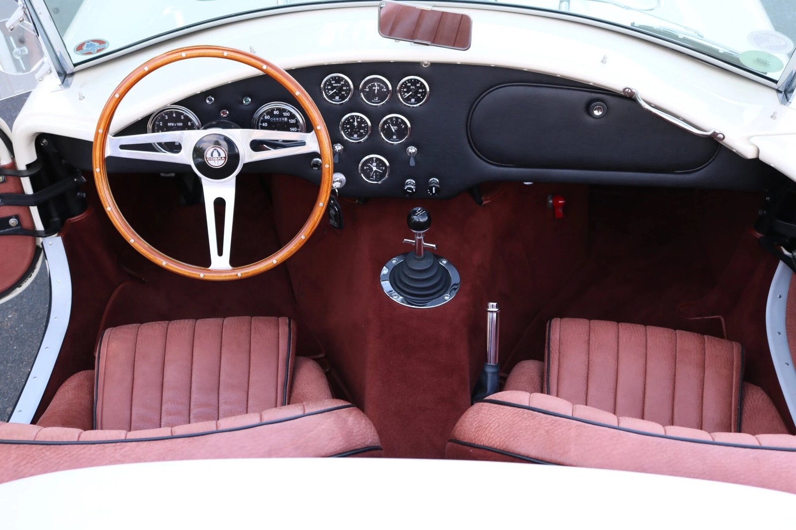 A 15″ wood-rim steering wheel is equipped along with competition-style lap belts, a glove box, windshield wipers, and Shelby-branded instrumentation.