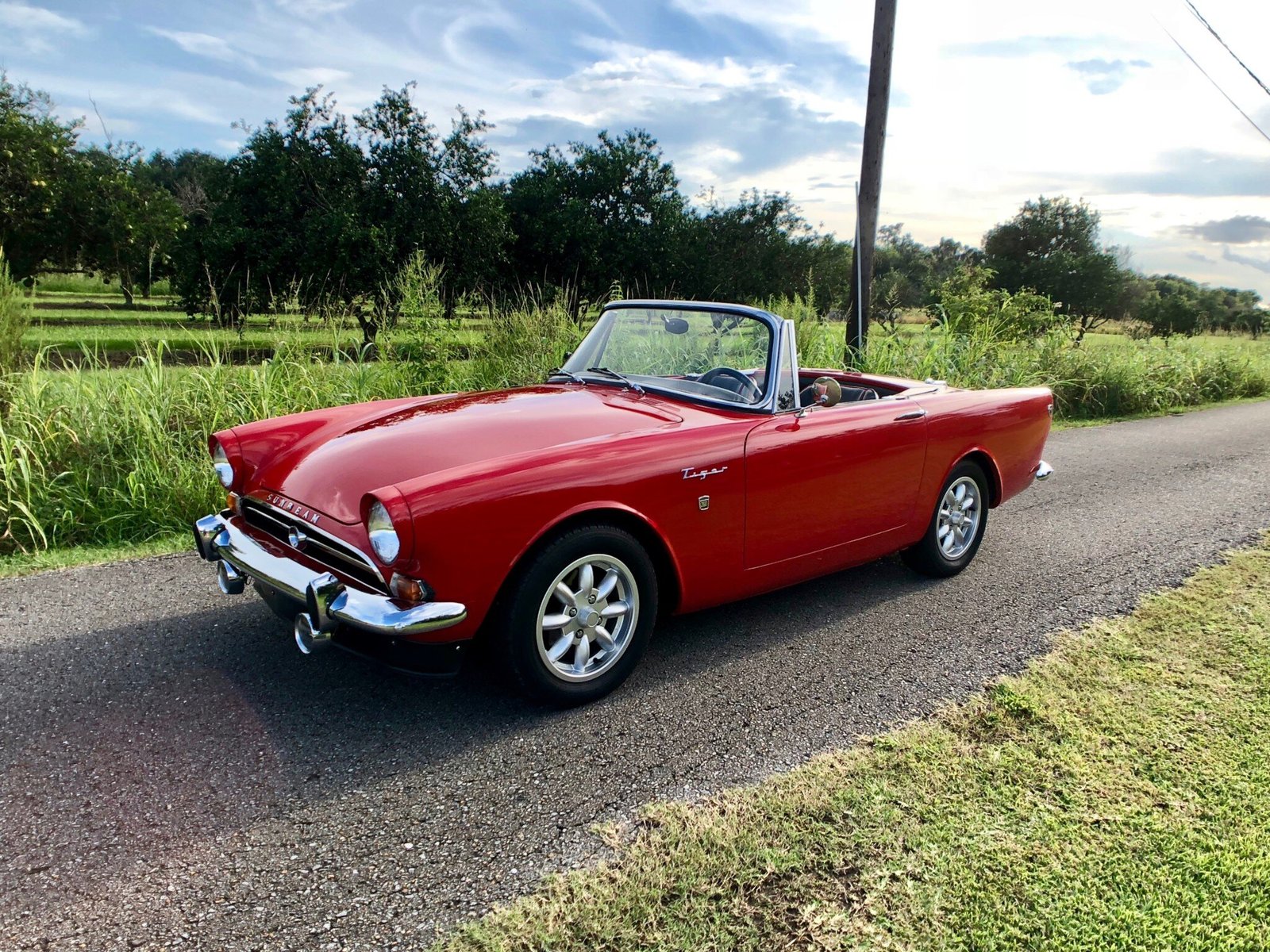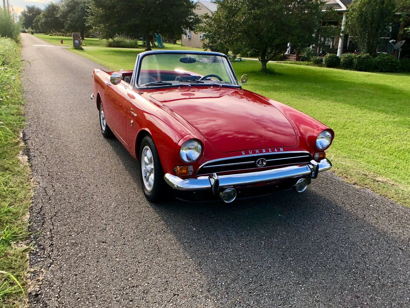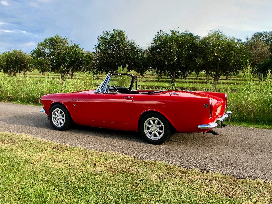 This 1965 Sunbeam Tiger is finished in red over a refurbished black interior and equipped with a black soft top and a removable hardtop.
