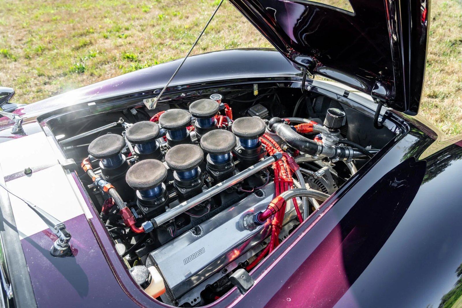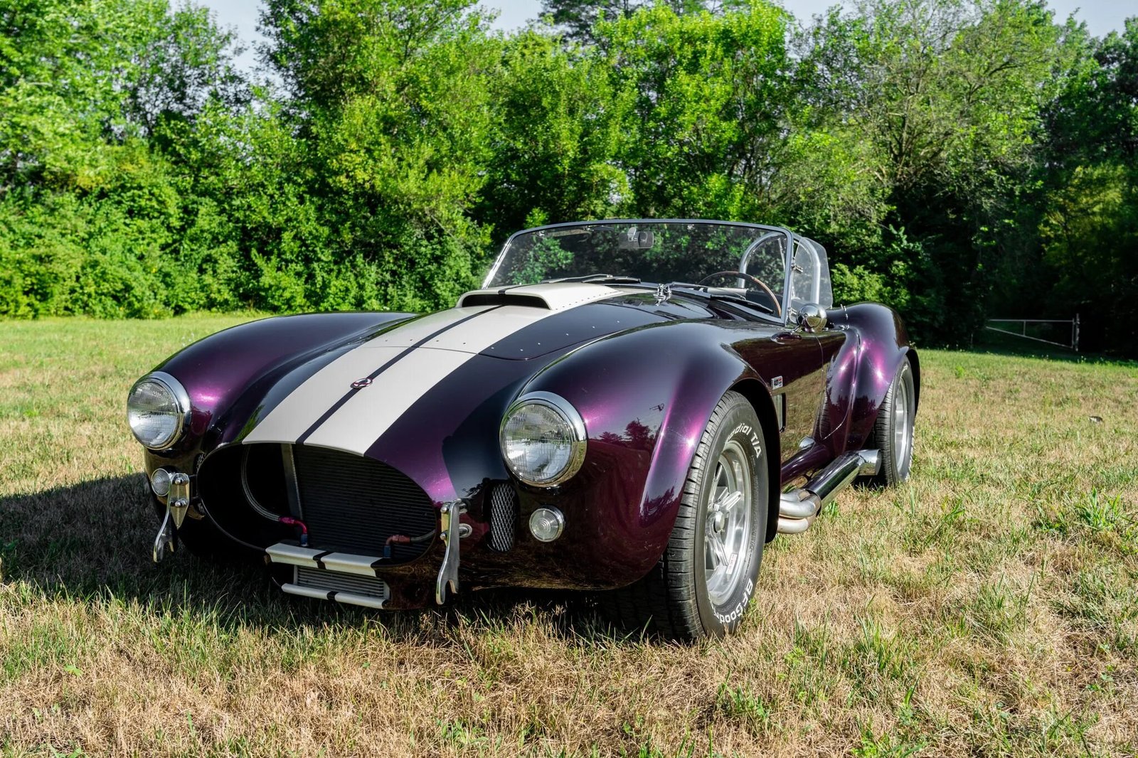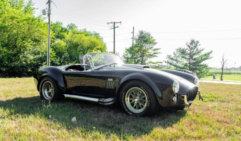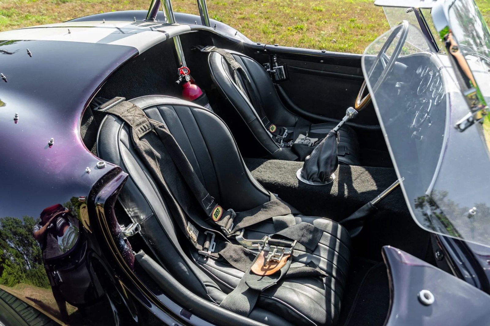 Power is provided by a stroker 427ci V8 mated to a Tremec five-speed manual transmission and equipment includes a Kinsler eight-stack fuel-injection system, Wilwood four-wheel disc brakes, adjustable coilovers, 15” Halibrand-style wheels, a chrome roll hoop, side exhaust pipes, quick-jack bumperettes, a hood scoop, a canvas soft top, Smiths instrumentation, and Deist racing harnesses.