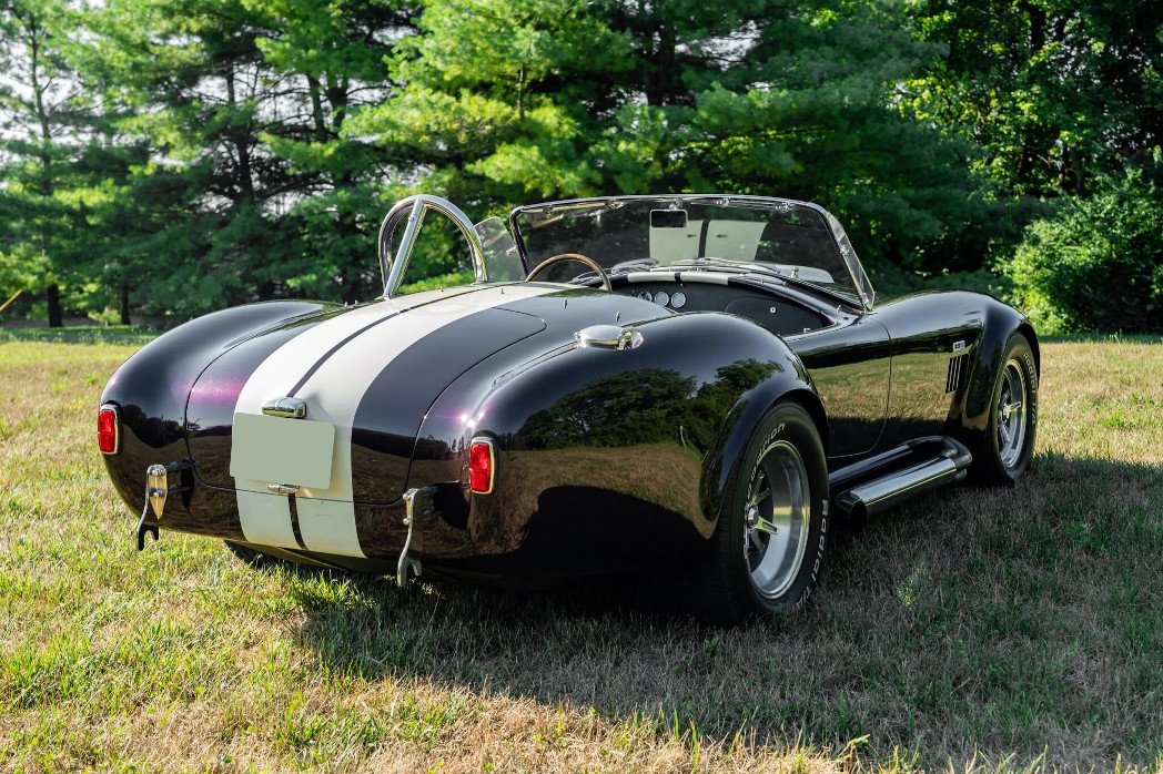 This Superformance MKIII is a Shelby Cobra replica that is finished in Black Rose with white stripes over black leather upholstery.