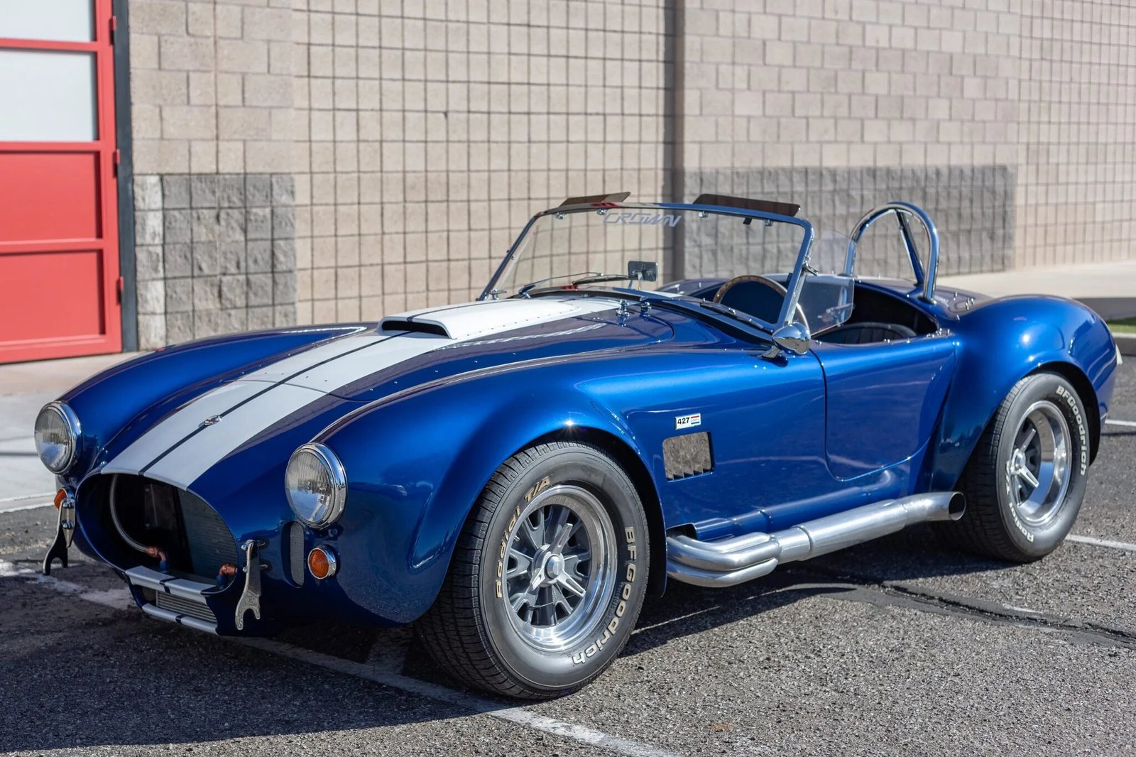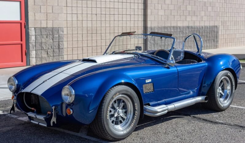 This Superformance MKIII is a Cobra replica, and it is powered by a 502ci Ford V8 mated to a Tremec five-speed manual transmission and a limited-slip differential. The car is finished in blue with white stripes over black leather upholstery, and features include a chrome roll hoop, side exhaust pipes, quick-jack points, four-wheel disc brakes, Halibrand-style knock-off wheels, and a Clarion AM/FM CD stereo.