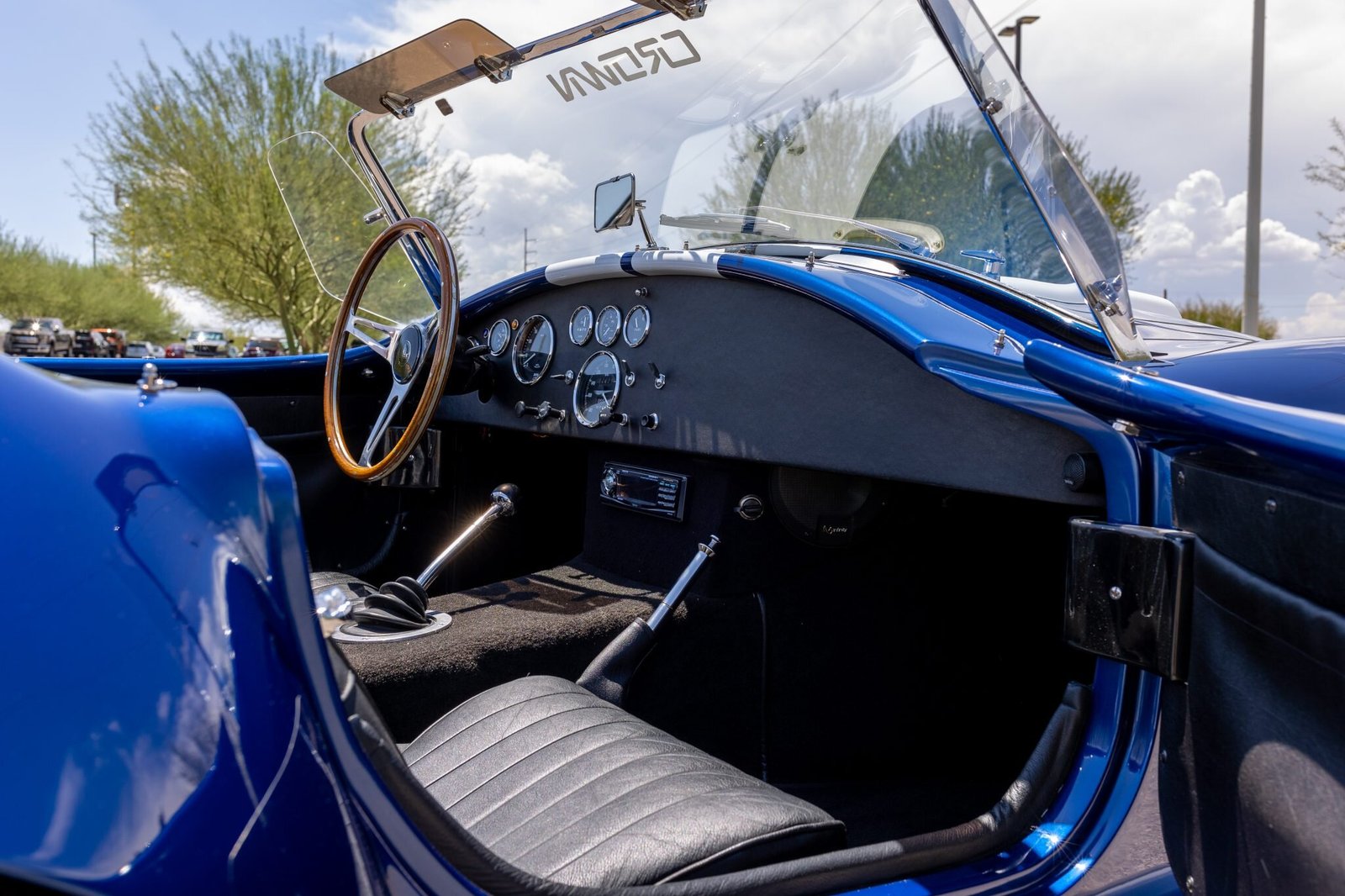A wood-rimmed steering wheel with a Cobra center cap sits ahead of Smiths instrumentation that includes a reverse-sweep 180-mph speedometer, an 8k-rpm tachometer, and auxiliary gauges.