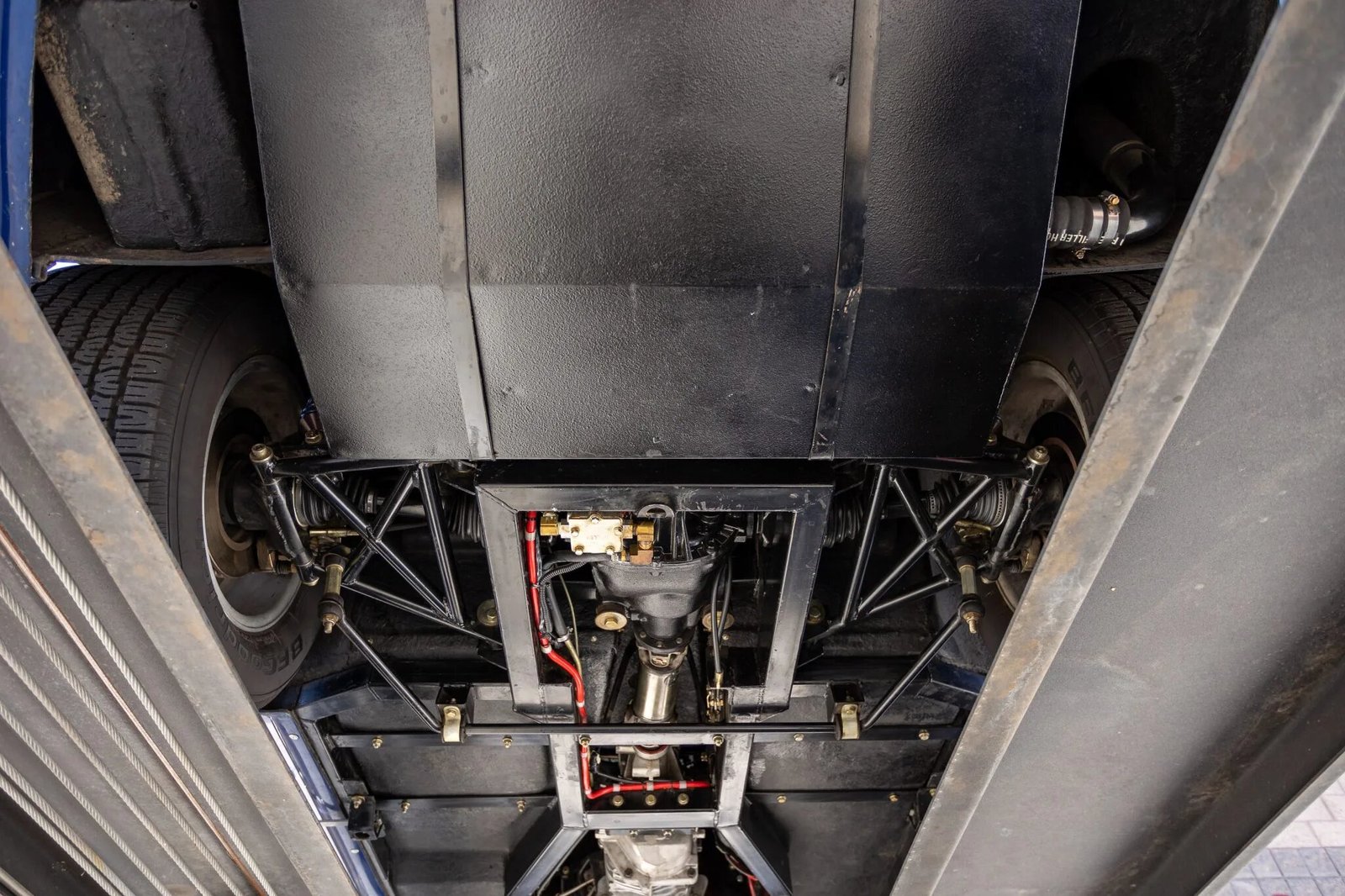Halibrand-style wheels are equipped with three-eared knock-off spinners secured with safety wire, and they are wrapped in BFGoodrich Radial T/A white-letter tires.