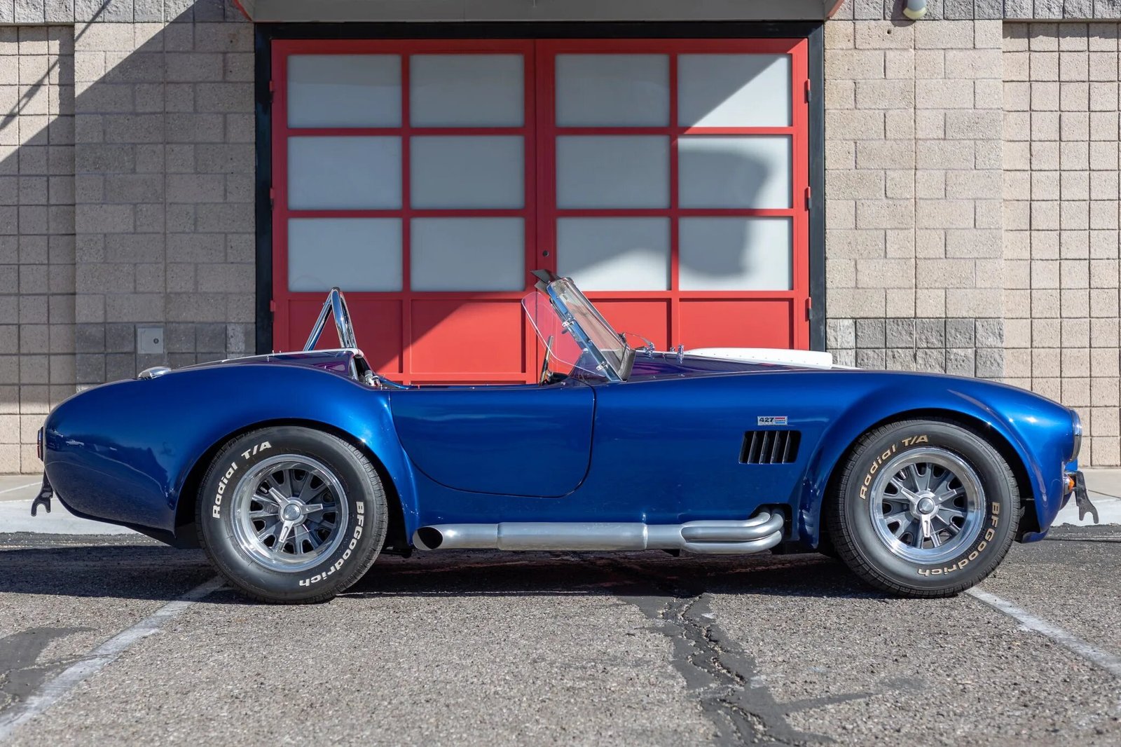 Frameless wing windows are mounted to the sides of the windshield, and additional exterior details include a bullet-style driver-side mirror, a chrome roll hoop, a Le Mans-style fuel filler, dual side exhaust pipes, and chrome quick-jack points.