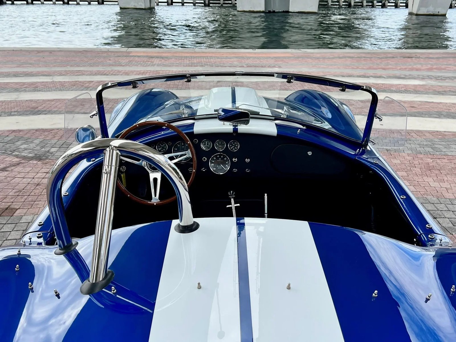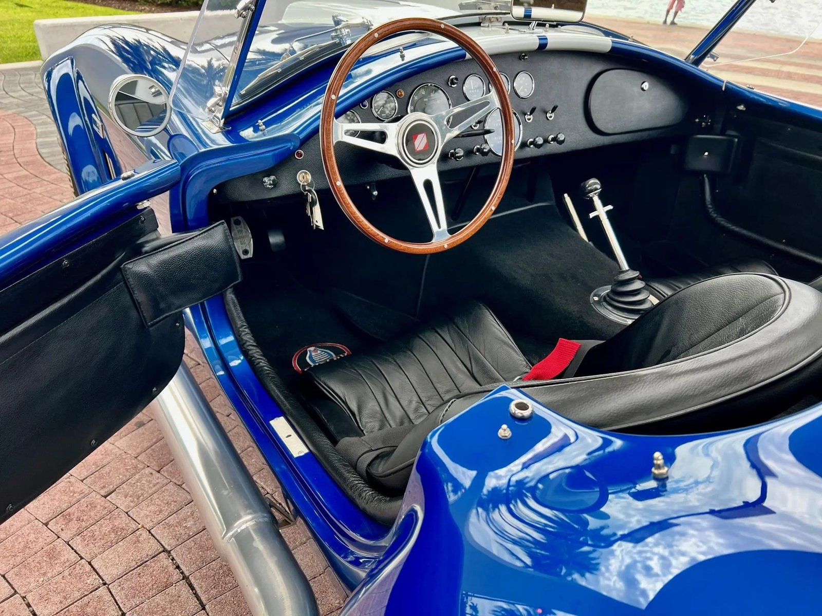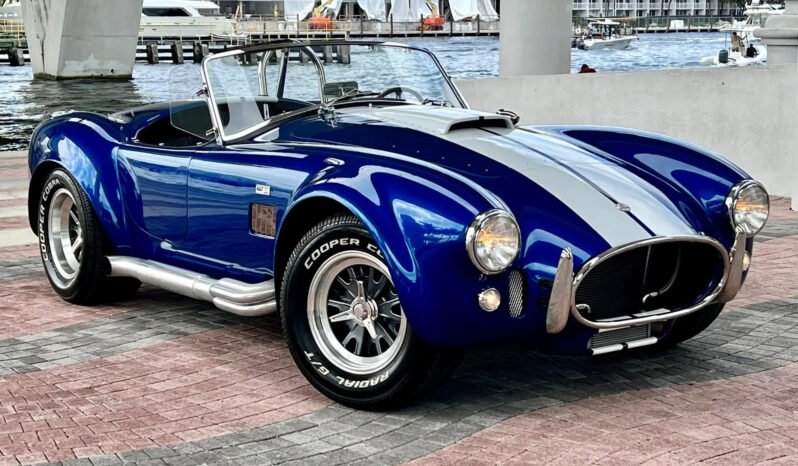 The Superformance MKIII features fiberglass bodywork over a rectangular steel frame with steel tube reinforcements, and this example is finished in blue with white center stripes and “427” side badges. Additional exterior details include a hood scoop, a driver-side polished roll hoop, ceramic-coated side exhaust pipes, wind wings, sun visors, fender vents, and a LeMans-style fuel cap. A tonneau cover is included in the sale.