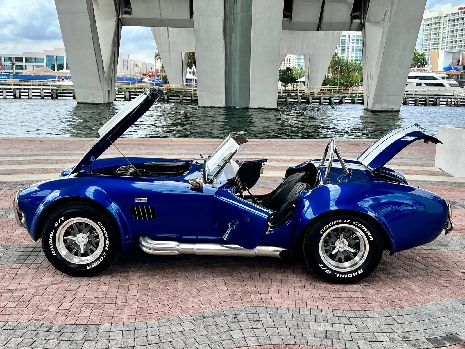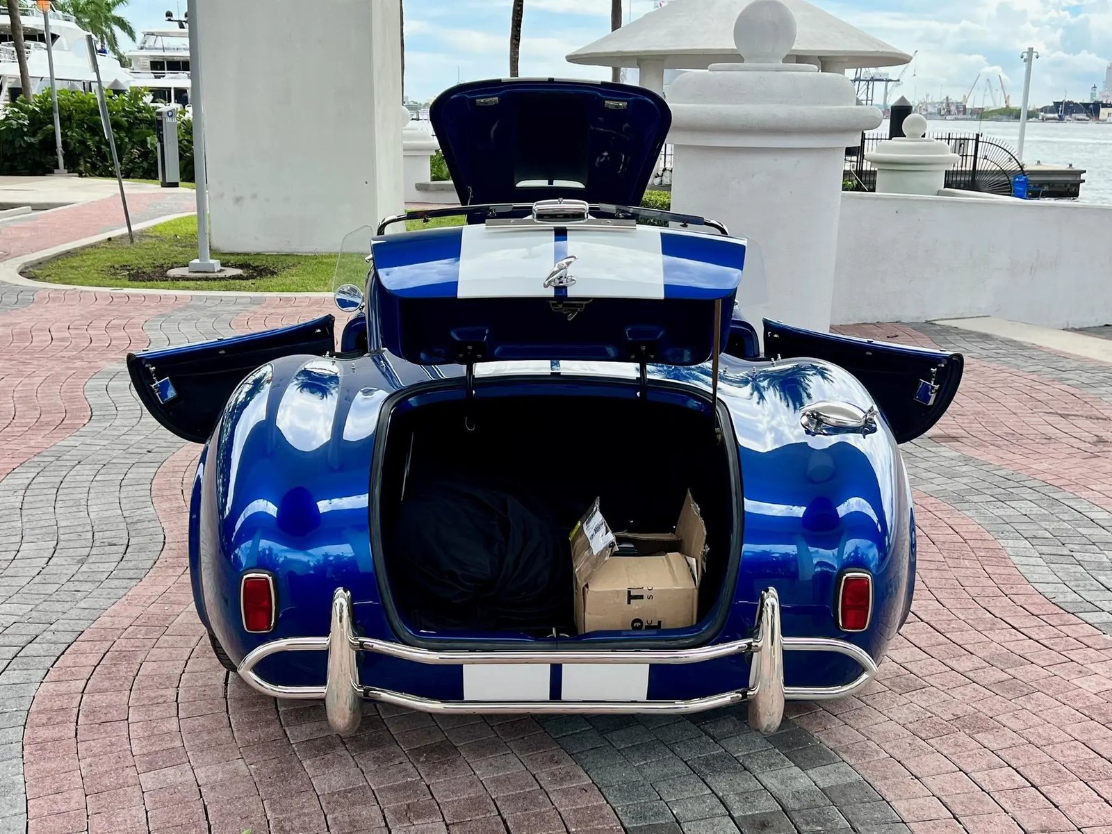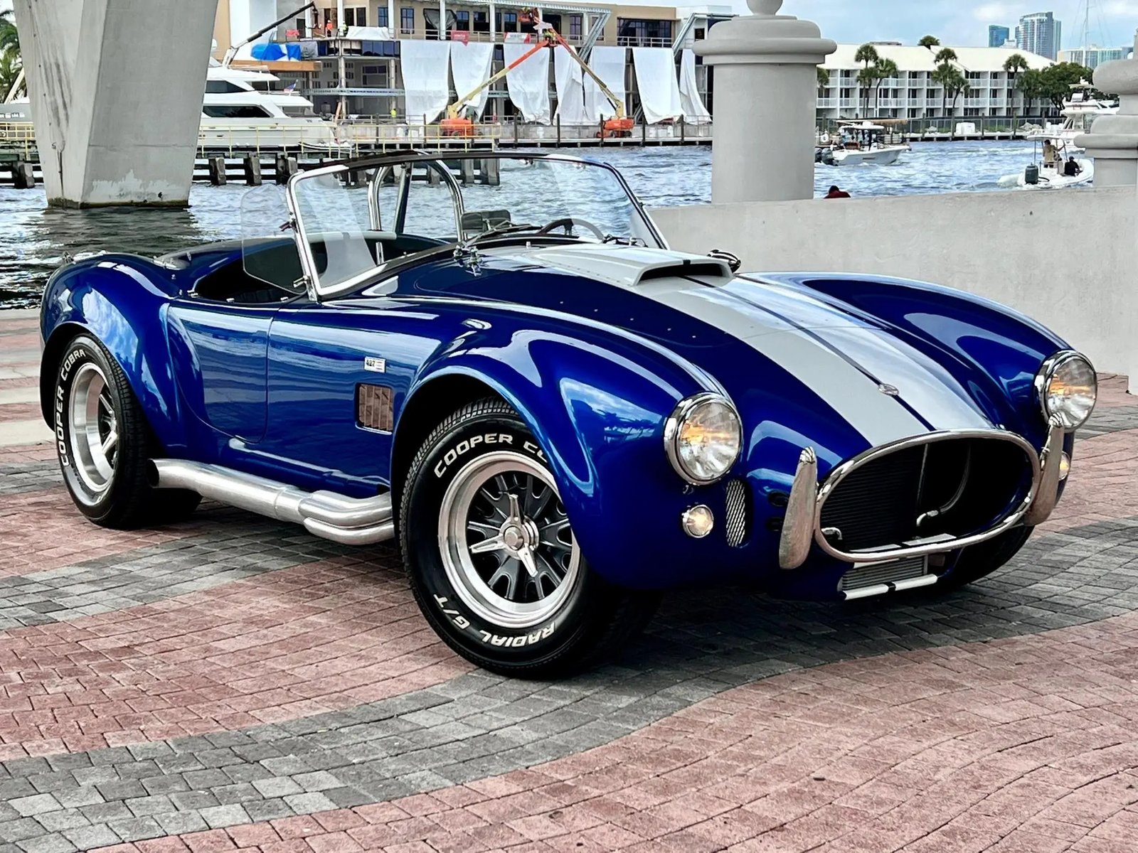 The Superformance MKIII features fiberglass bodywork over a rectangular steel frame with steel tube reinforcements, and this example is finished in blue with white center stripes and “427” side badges. Additional exterior details include a hood scoop, a driver-side polished roll hoop, ceramic-coated side exhaust pipes, wind wings, sun visors, fender vents, and a LeMans-style fuel cap. A tonneau cover is included in the sale.