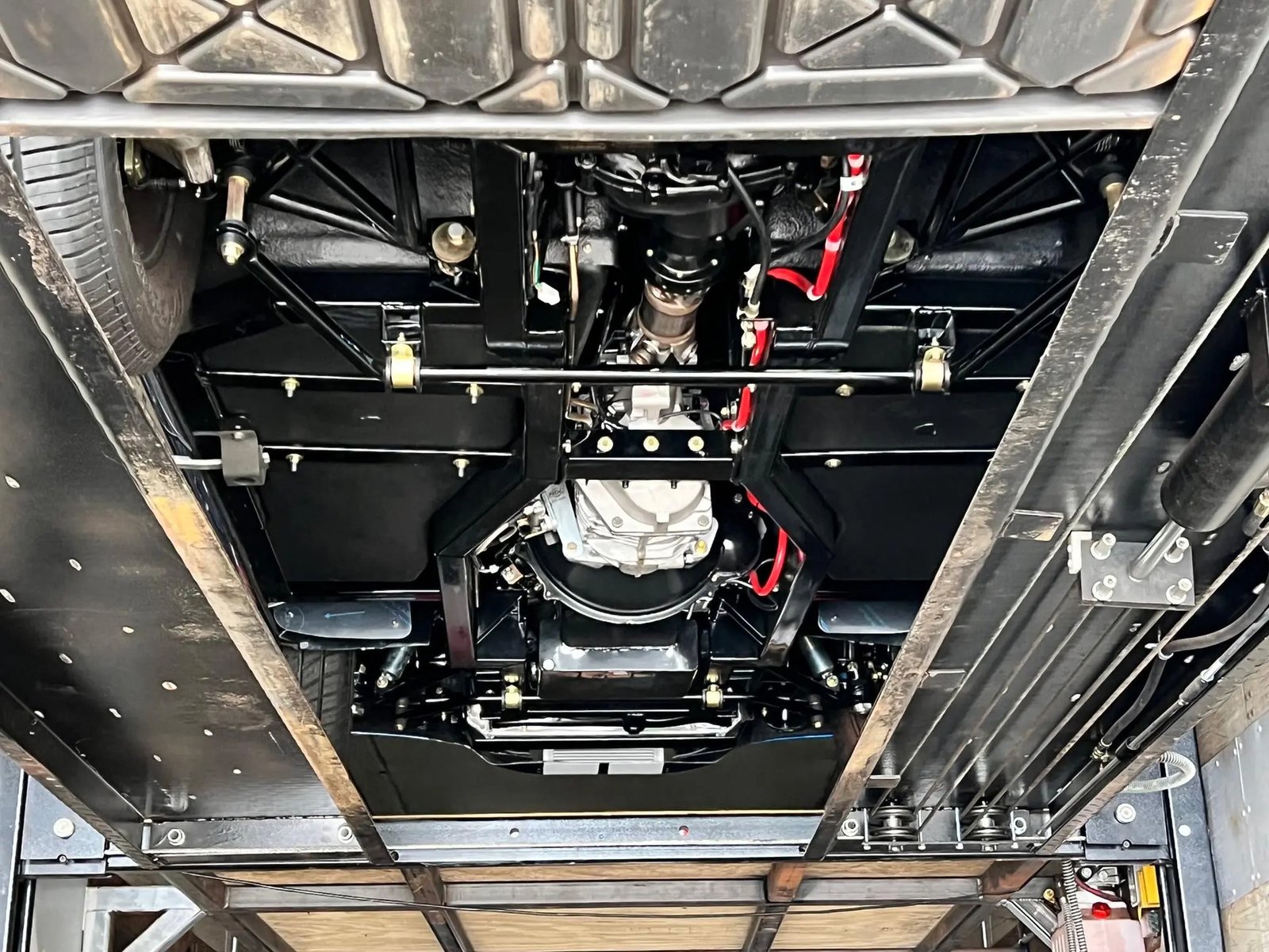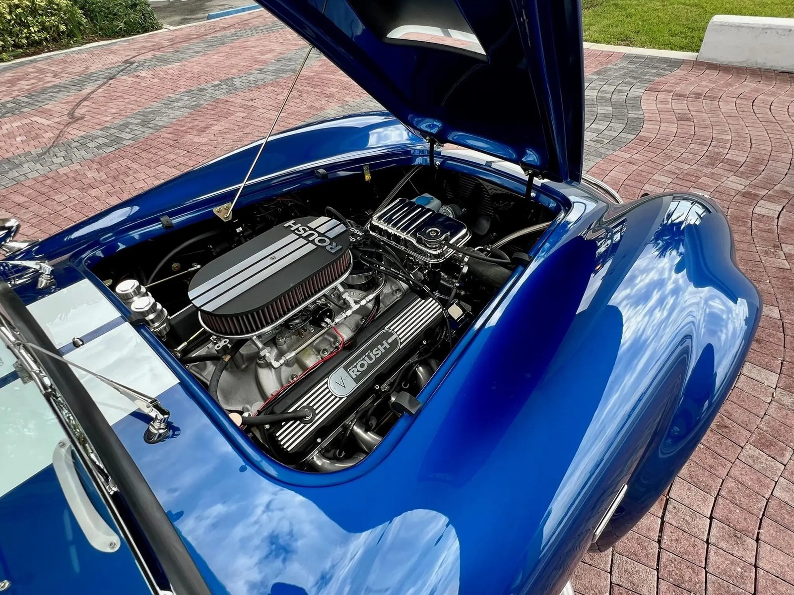 The 427ci V8 is a Roush Racing-sourced 427SR crate engine and features a Holley carburetor, cast Edelbrock intake manifold, MSD ignition, and ceramic-coated long-tube headers. An oil change was performed in preparation for the sale. Power is sent to the rear wheels through a Tremec five-speed manual transmission.