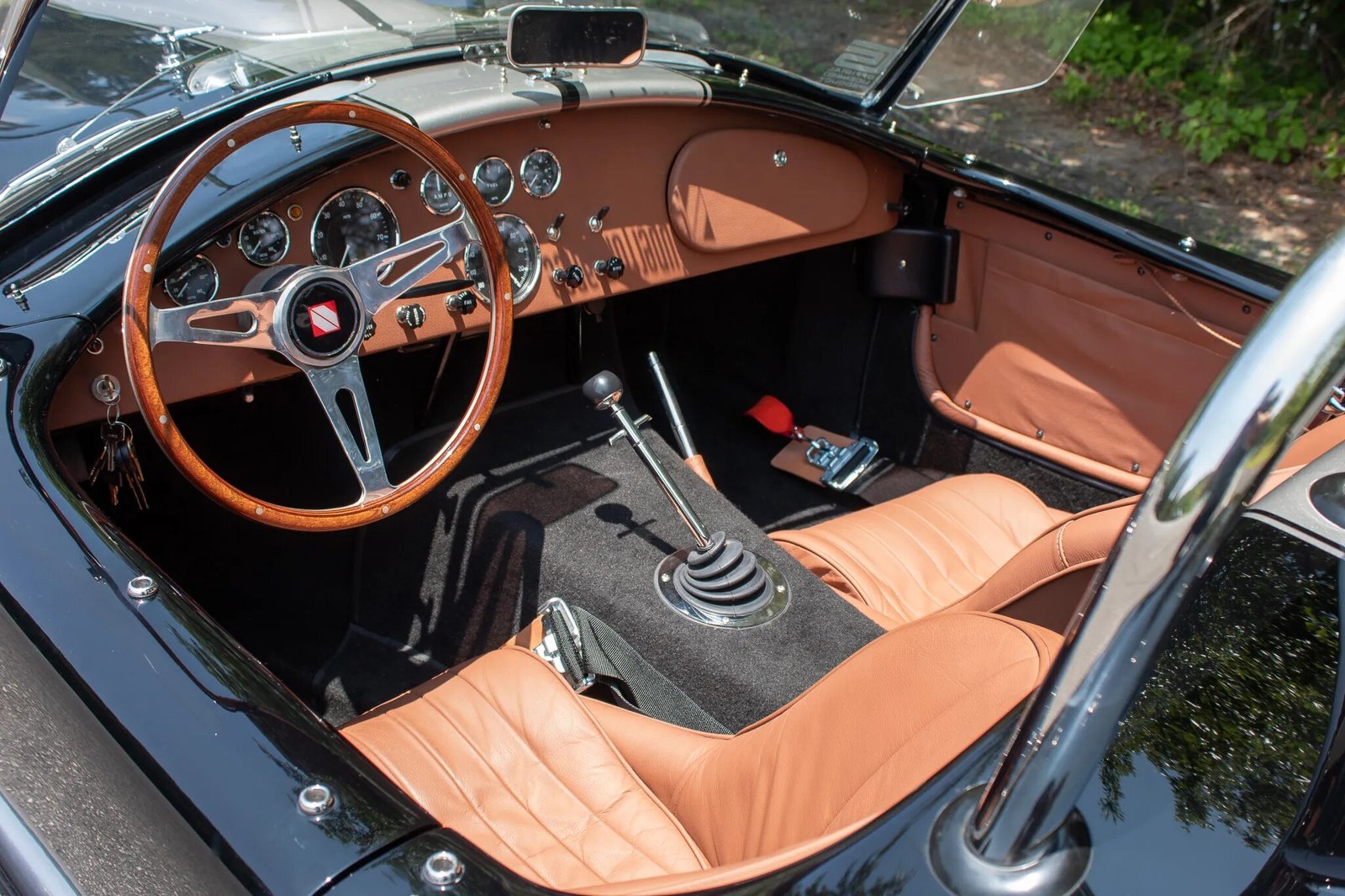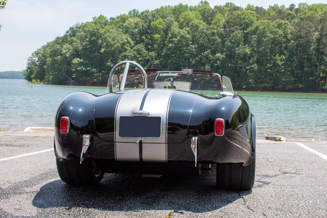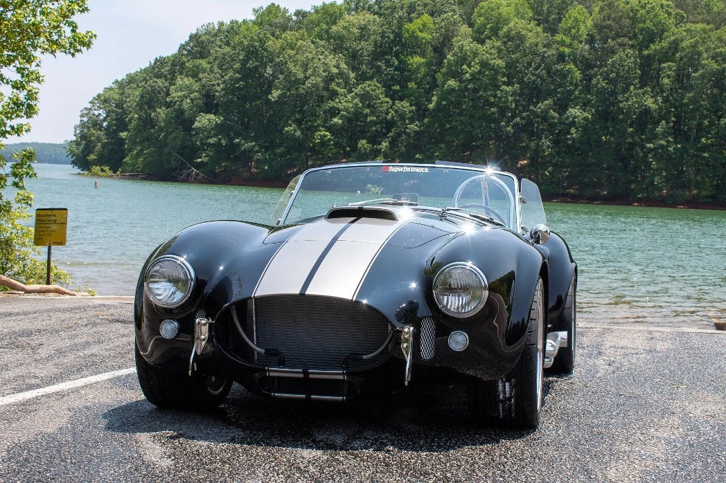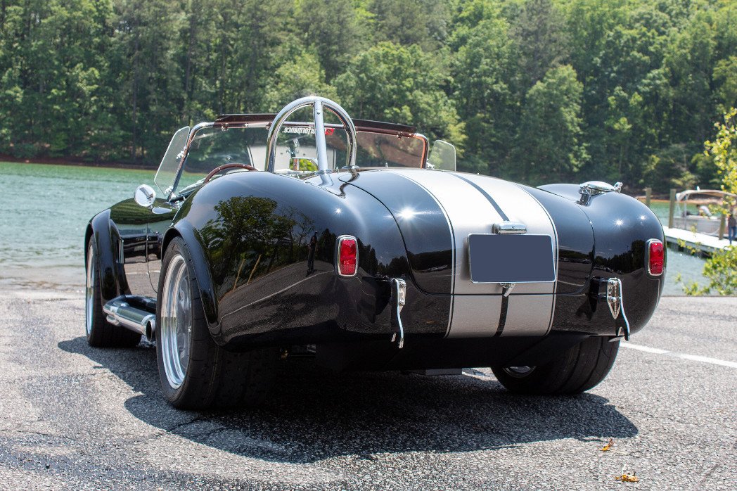The Superformance MKIII features fiberglass bodywork over a rectangular steel frame with steel tube reinforcements, and this example is finished in black with silver over-the-top stripes.