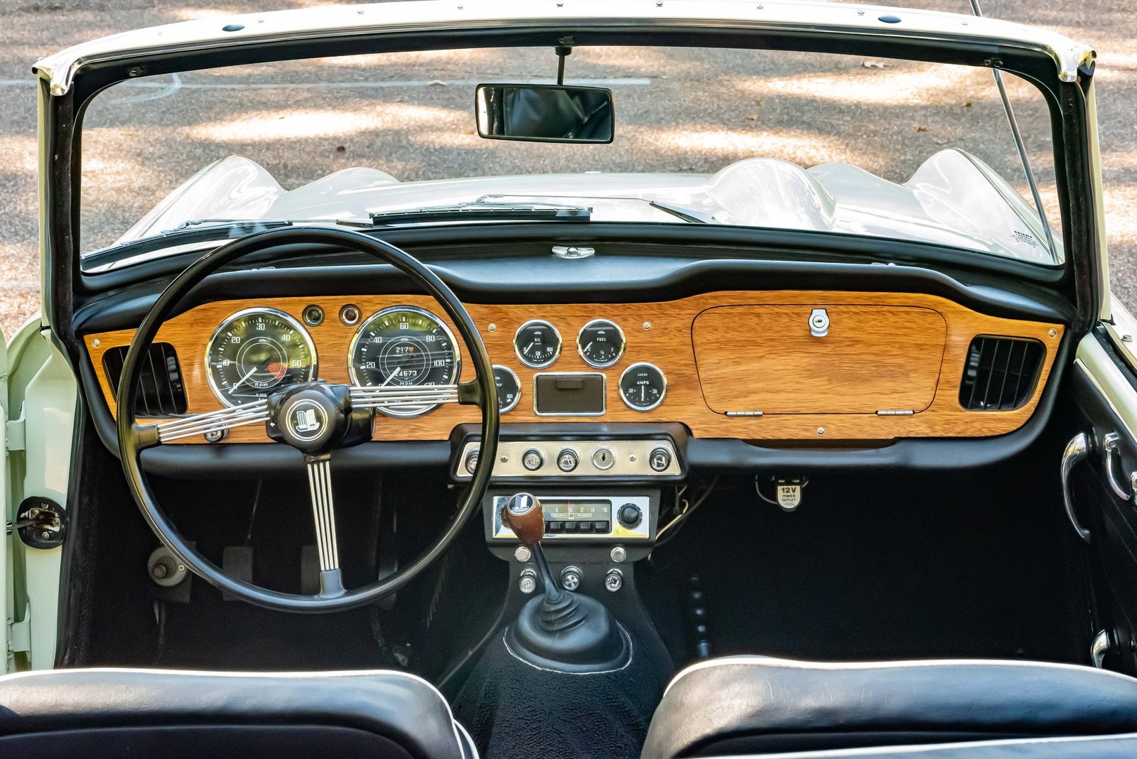 It is an accurate restoration with a matte-finish wood dash with a rare factory radio, the correct Triumph instruments, and the original shifter.