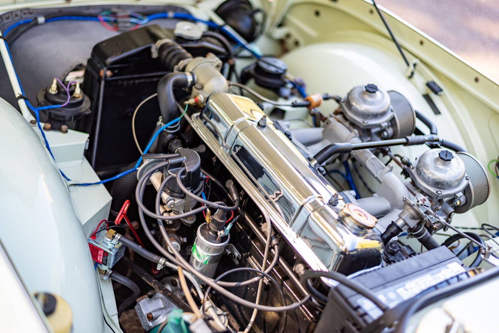 Under the forward-opening bonnet lies the 2,138cc inline-four cylinder engine sporting two Stromberg carbs.