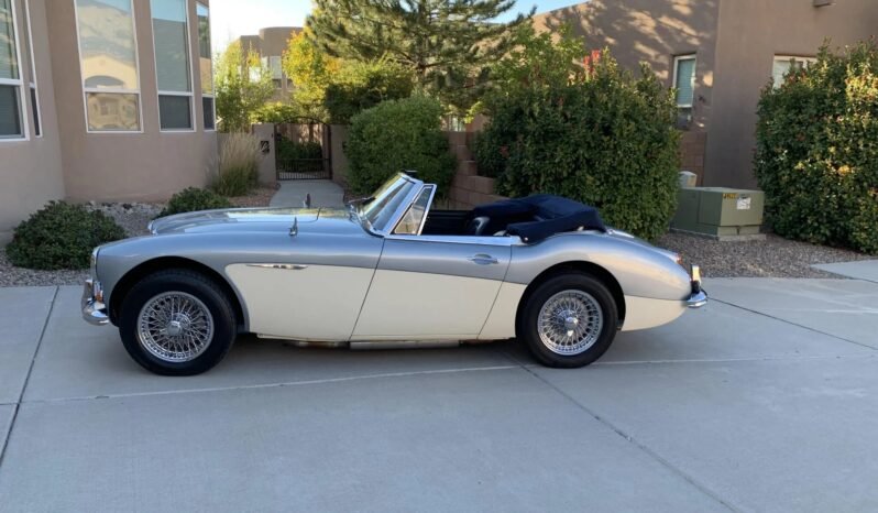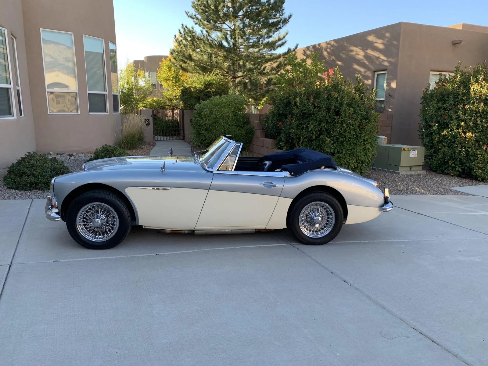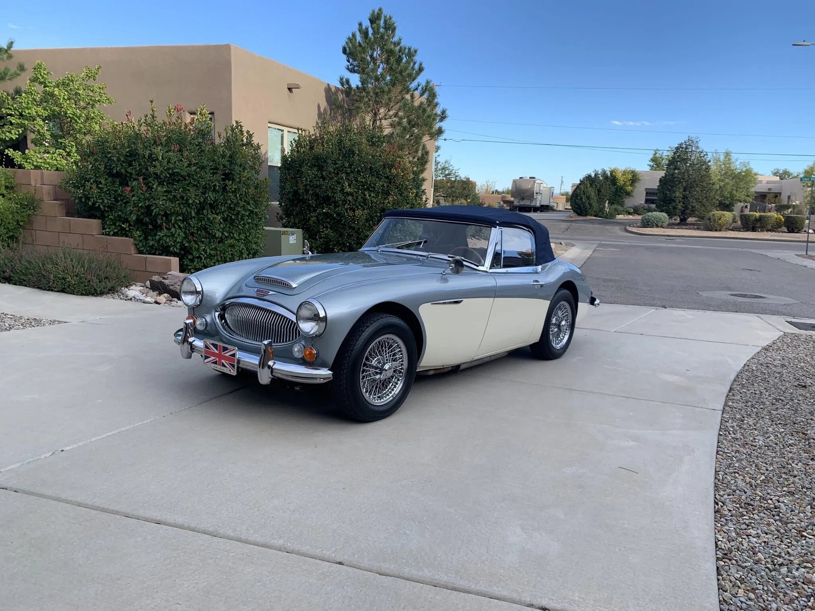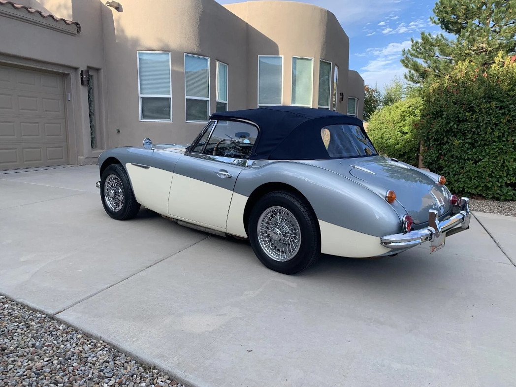 This 1966 Austin-Healey 3000 BJ8 Mk III was refurbished in the late 1990s. The car is powered by a 2.9-liter inline-six mated to a four-speed manual transmission with overdrive and is finished in blue and white over blue leather upholstery. Equipment includes a dark blue soft top, Pertronix electronic ignition, dual SU carburetors, a digital AM/FM radio, front disc brakes, and chrome knock-off wire wheels.